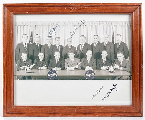 Early Astronaut Group Photo With 4 Autographs. Many familiar faces in the group, 16 total. Framed 16 x 14". Signed by John Young, Charles Conrad, Alan Shepard (autopen?) and Deke Slayton. A bit faded but still a very nice photograph.