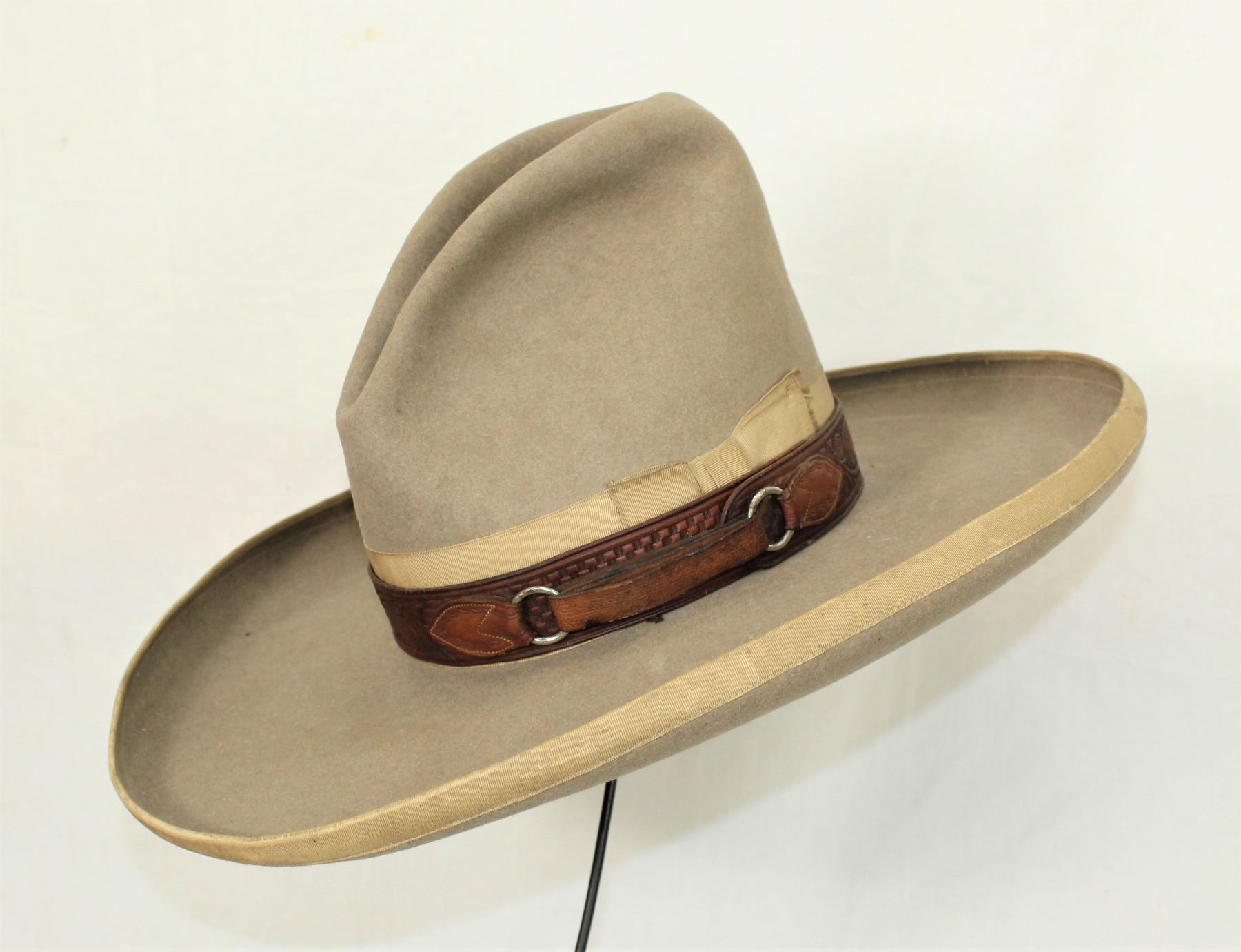 Early 20th Century cowboy hat with a great look, approximate size 7 1/4, MLH brand embossed in the sweatband, with a tall 8" crown shaped in a Tom Mix style, with a wide bound pencil rolled 5 1/2" brim. In very nice condition, with great leather hatband.