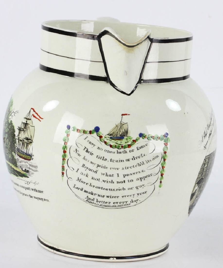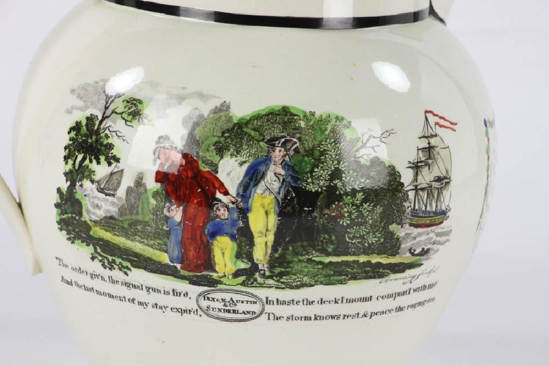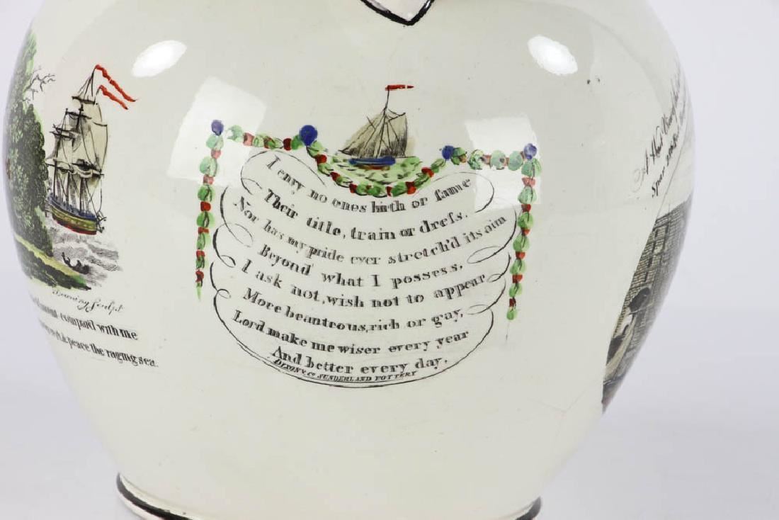 Early English Sunderland pitcher, West View of the Cast Iron Bridge over the River Wear at Sunderland Built by R. Burdon, Esq., M.P. span 236 feet, height 100 feet, begun 24 Sept. 1793, opened 9 Aug. 1796. 8 1/2" x 10". Note small star lines on side.