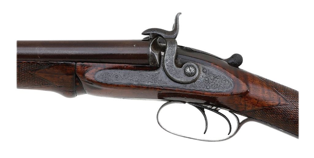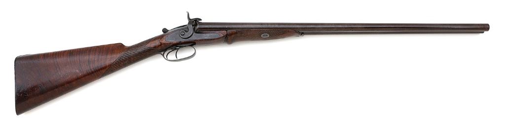 serial #A3577, 12 ga Pinfire, 28'' damascus barrels with partially bright about good bores showing scattered light pitting that is a bit more noticeable for a few inches ahead of the chambers. The barrels show generous remnants of an old plum-brown finish applied over some scattered areas of oxidation and minor pinprick pitting, evidence of good damascus patterns along the ribs and more protected areas. The barrel rib retains strong markings with October 10, 1865 patent date and 170 New Bond St. London address. The lockplates are a pleasant deep smoky gray patina showing nice English foliate scrollwork embellishments and dolphin head hammers. Both lockplates are maker-marked and the familiar 1864 patent top lever shows Richards patent mark. The checkered walnut buttstock and forend with wedge fastener and lipped horn tip insert remain in very good plus condition showing scattered light dings and handling marks otherwise maintaining a nice honest appearance overall with nice fit and the sides of the buttstock exhibiting some fine grain figure. The wedge escutcheons and monogram plate along the toe line are of silver and length-of-pull to the smooth steel buttplate is 14''. The barrels lock-up solid on-face and the locks seem to function well mechanically with crisp in-time hammers. A very respectable example of an early Westley Richards double. (13B11621-107) {ANTIQUE} (700/900)