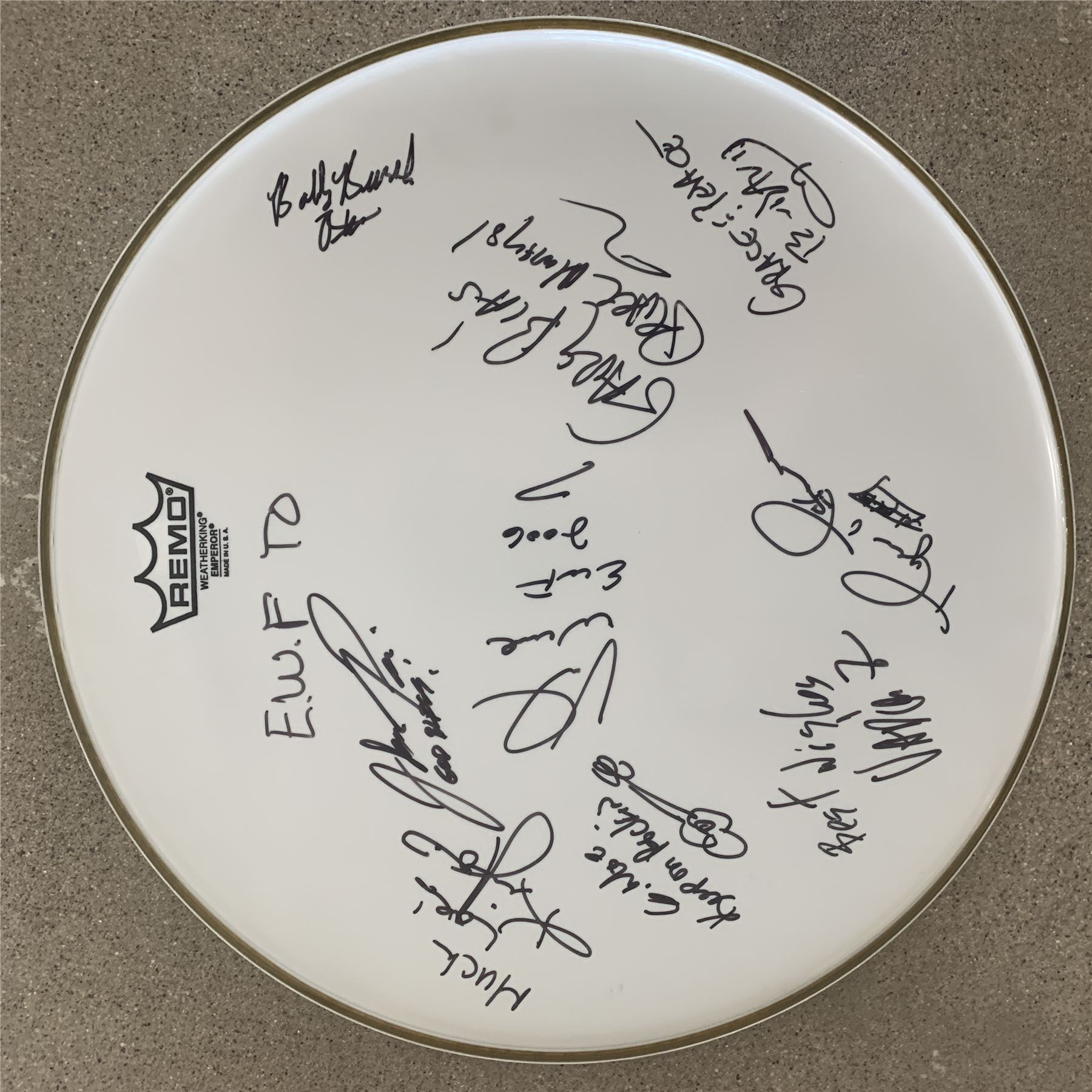 Earth, Wind and Fire signed drum head autographed by Reggie Young, John Paris, Kim Johnson, Bobby Burns, Gary Bias, Myron McKinley, B. David Whitworth, Vadim Zilbertstein and Greg Moore. 15 inches