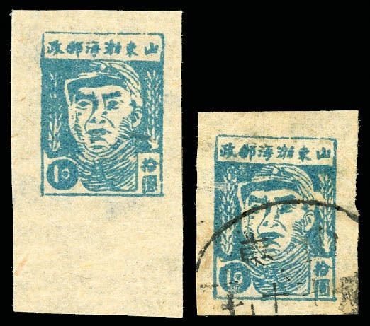 East China, 1947, Shandong Bohai Post, Zhu De, 10 round 0 blue Yang EC180, two stamps, one mint, one used; both exceptionally clean and framed by gargantuan margins the mint stamp a bottom margin single; what appears as a black line on Chus left shoulder is a bit of wood fiber showing through from the back, without gum as issued, Very Fine+, a pretty duo.