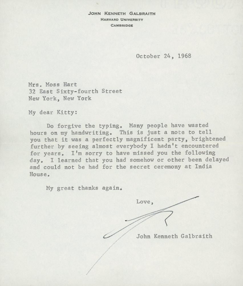 John Kenneth Galbraith (Harvard University) signed letter dated October 24, 1968
