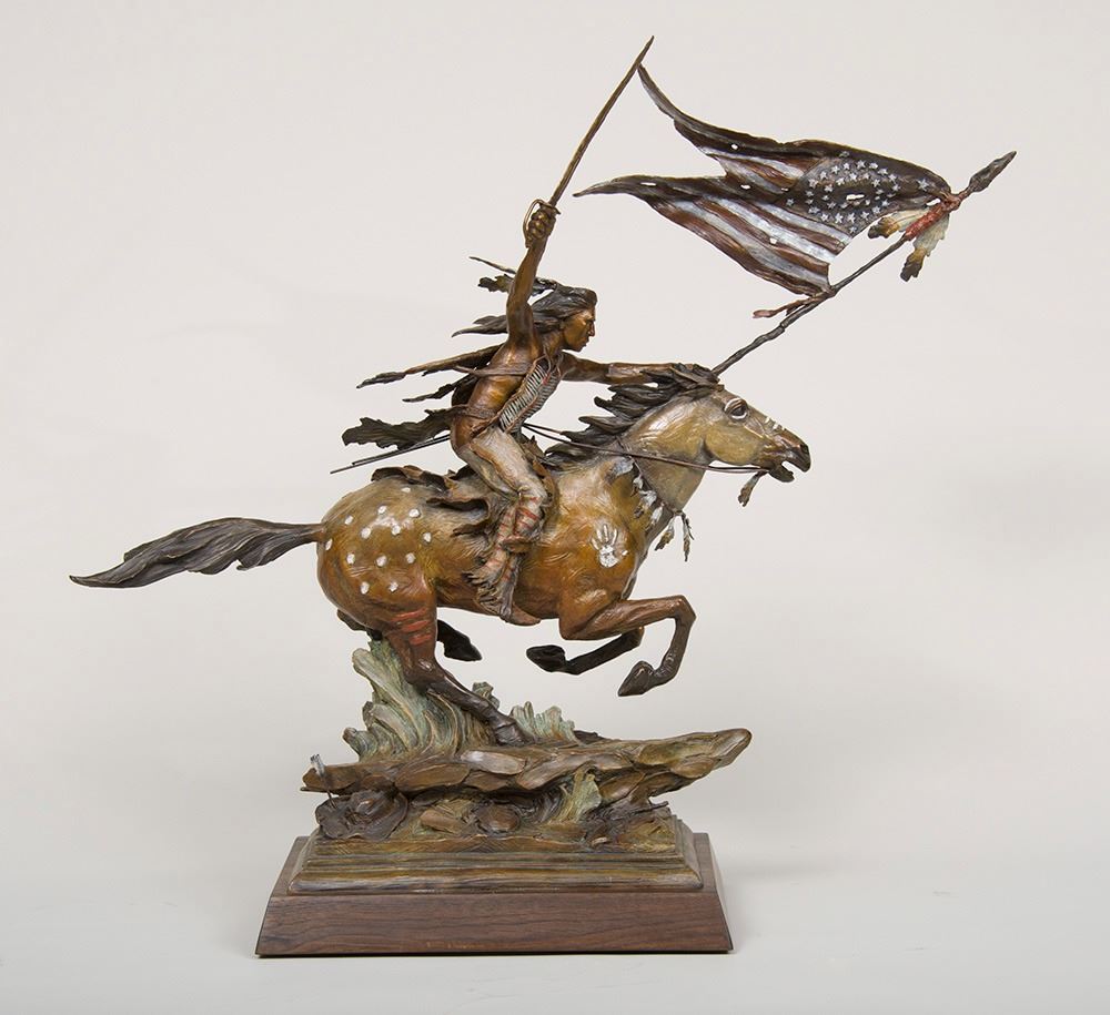 Artist: Ed Natiya; Title: Final Charge; Medium: Bronze, cast 18/25; Dimensions: 30 1/2 inches overall height; Signed: Signed; Framed/Base: 30.5 x 30 x 10.5 inches - 42 lbs.