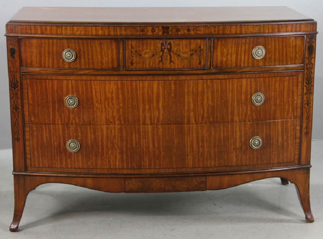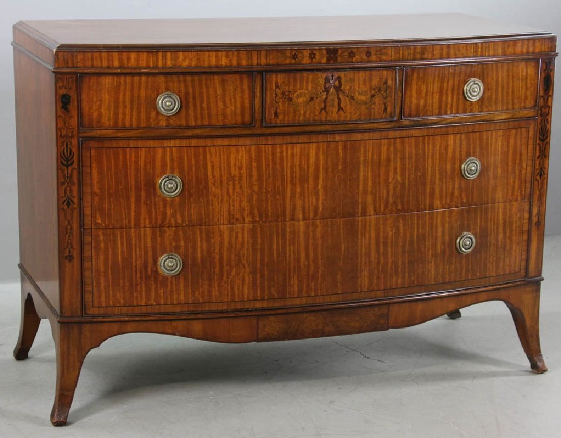 Edwardian marquetry inlaid satinwood bow-front five-drawer chest, circa 1900, 36" H x 49" W x 23" D. Provenance: New York estate.