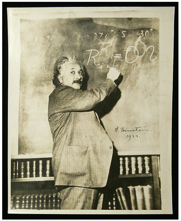 Einstein, Albert (1879-1965) German-born physicist; awarded the Nobel prize for physics in 1921. Vintage photo signed ("A. Einstein, 1933"). 8 x 10 in., n.p. A three-quarter portrait of Einstein writing a formula on a blackboard. Signed in black ink.