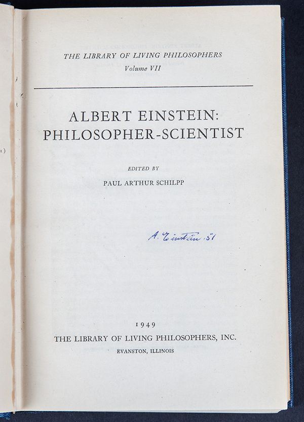 Einstein, Albert. 1st Edition of Albert Einstein: Philosopher-Scientist (The Library of Living Philosophers, Inc., Evanston, Illinois, 1949) signed on the title page ("A. Einstein, 51"). Some wear to blue cloth covers and pages are lightly toned throughout. Einstein turned 72 in 1951, the year he signed this book.