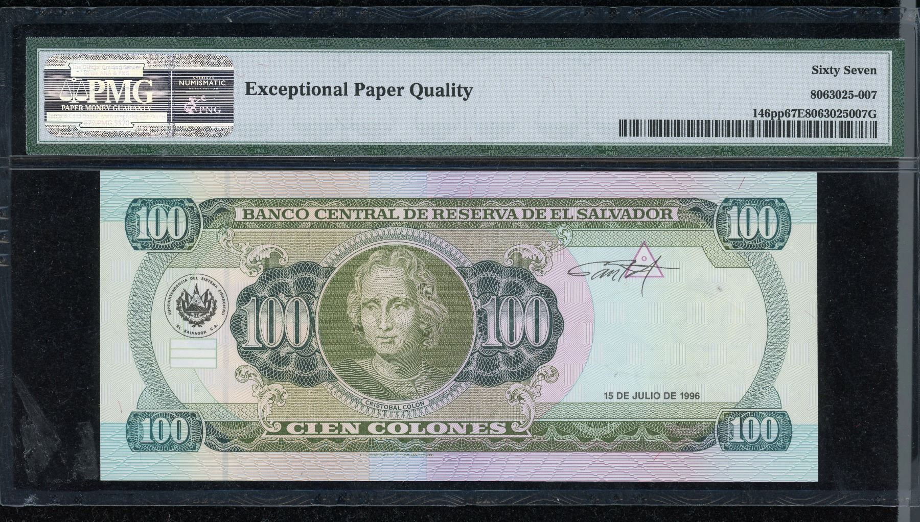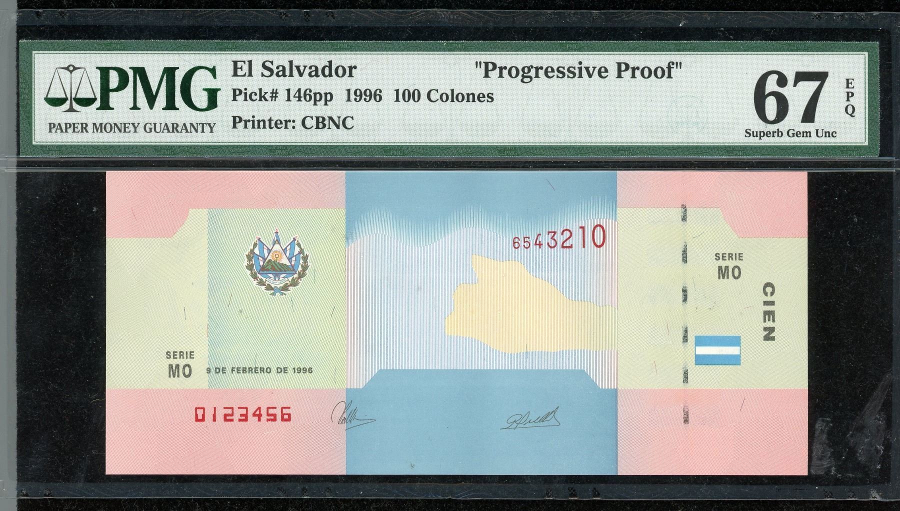 A lovely Progressive Proof of the El Salvador 100 Colones note of 1996 (P.146pp), printed by the Canadian Bank Note Company, PMG Gem UNC-67 with "ladder" S/N: 0123456.