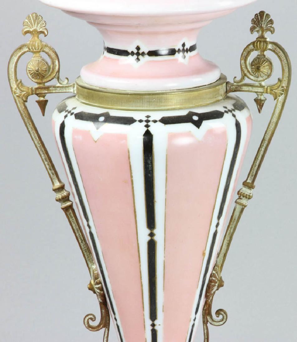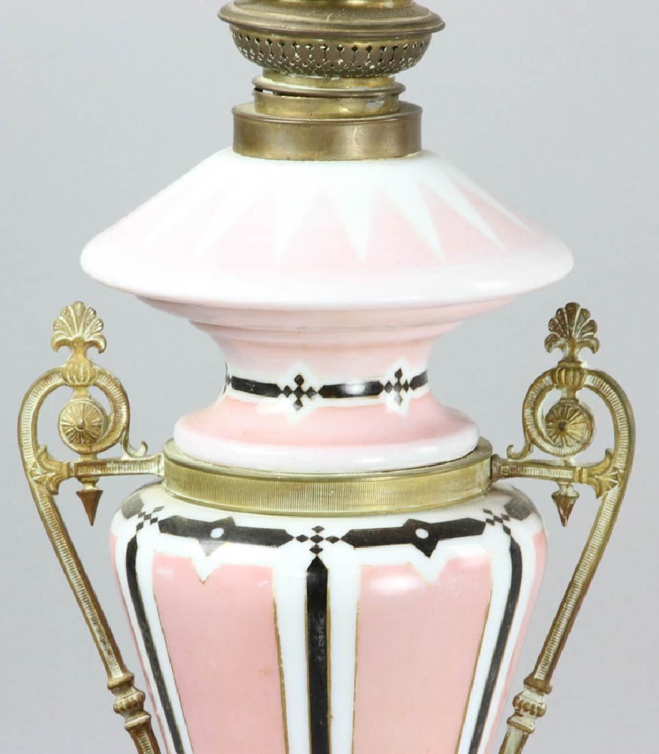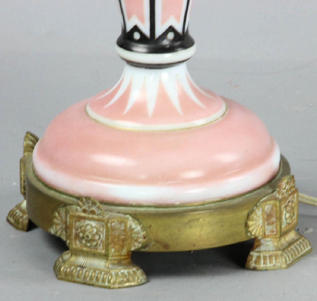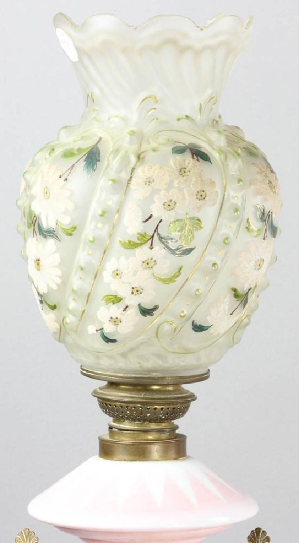 Electrified oil lamp with hand-decorated shade, 29 1/2" H (overall). Provenance: West Palm Beach, Florida estate.