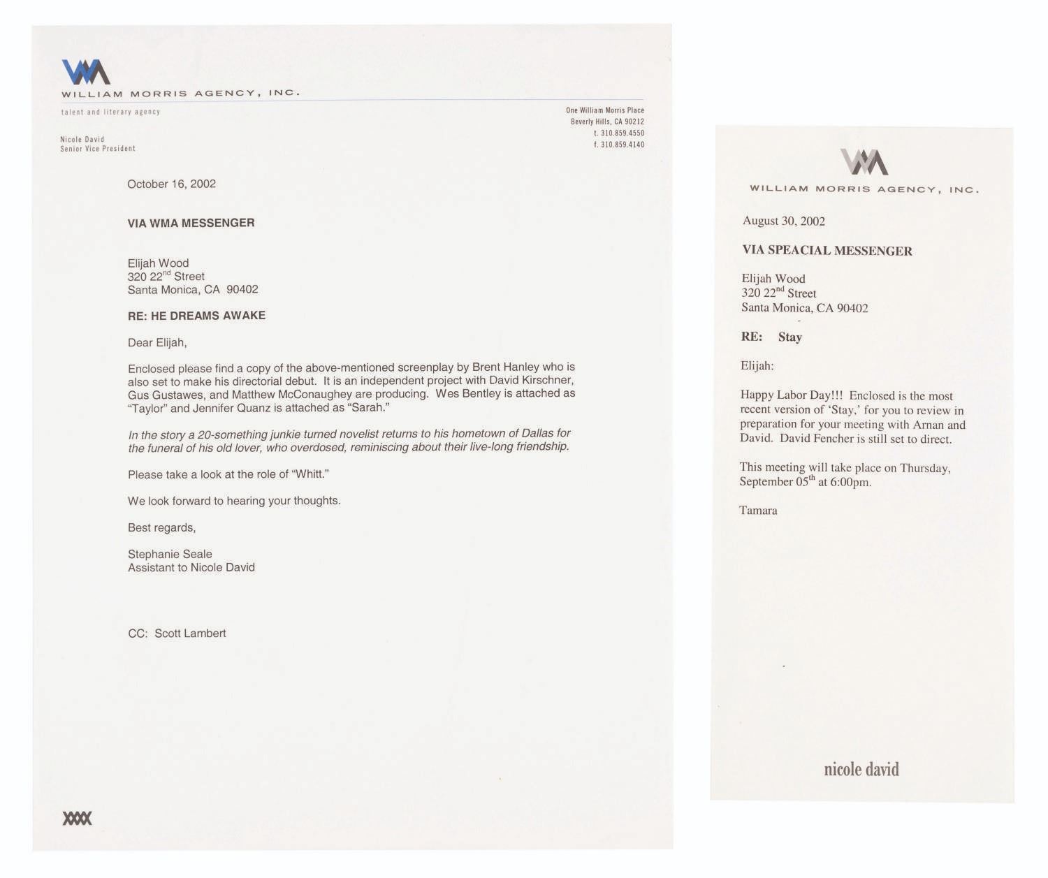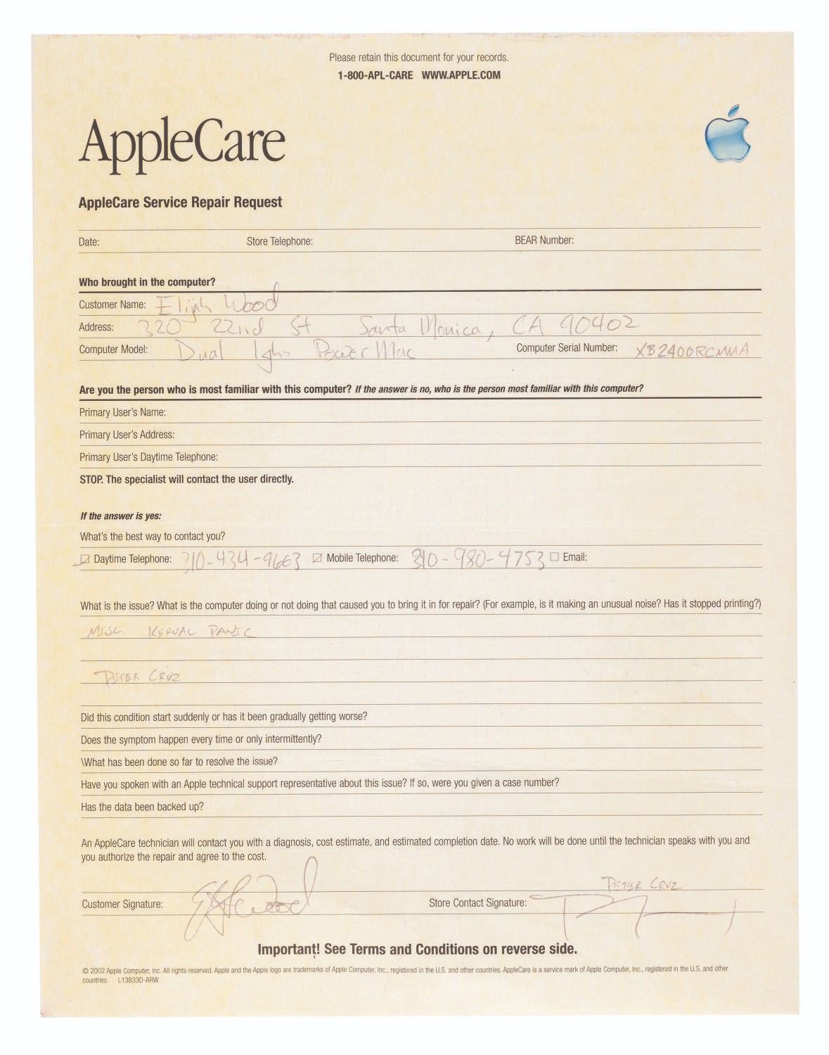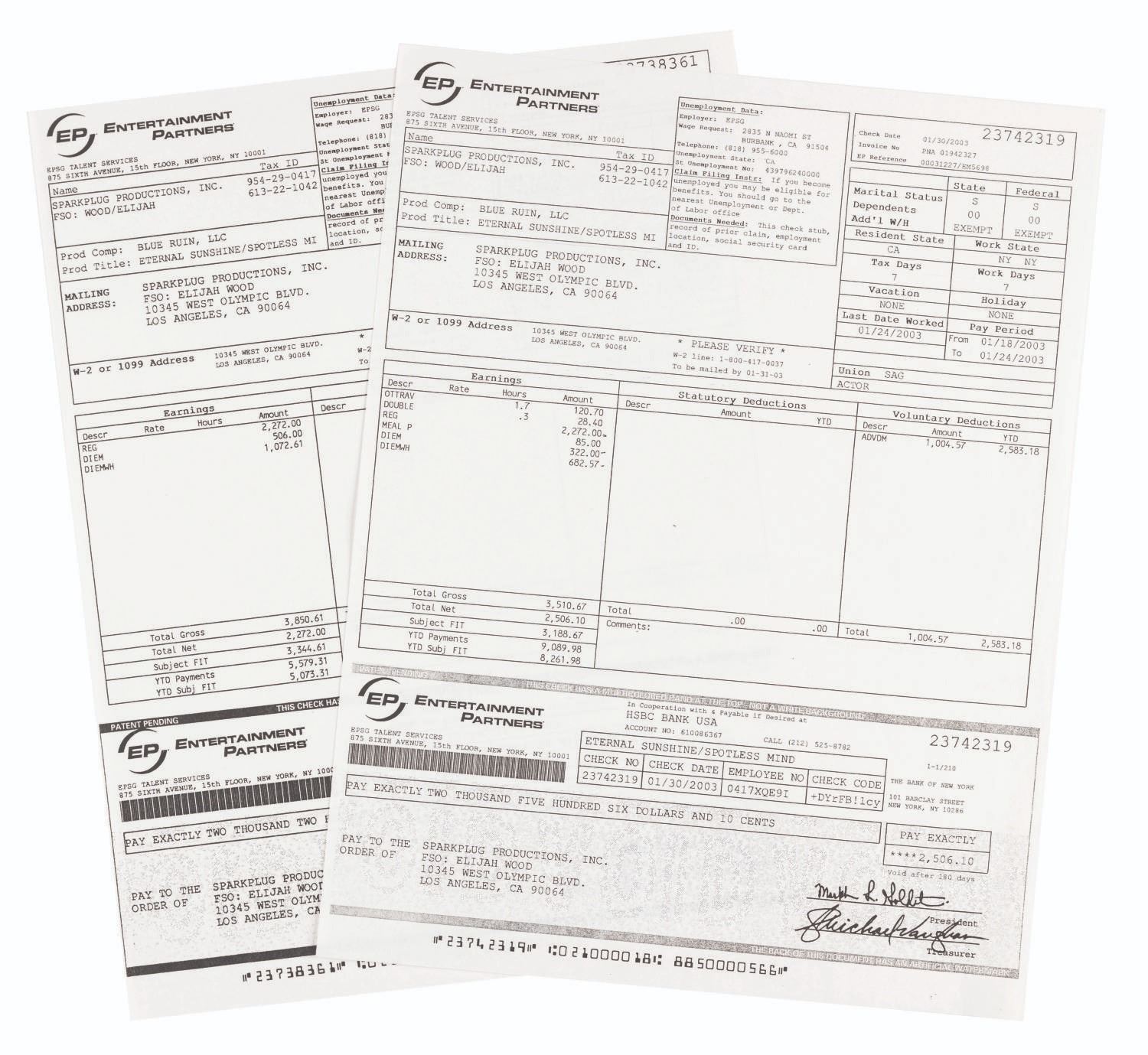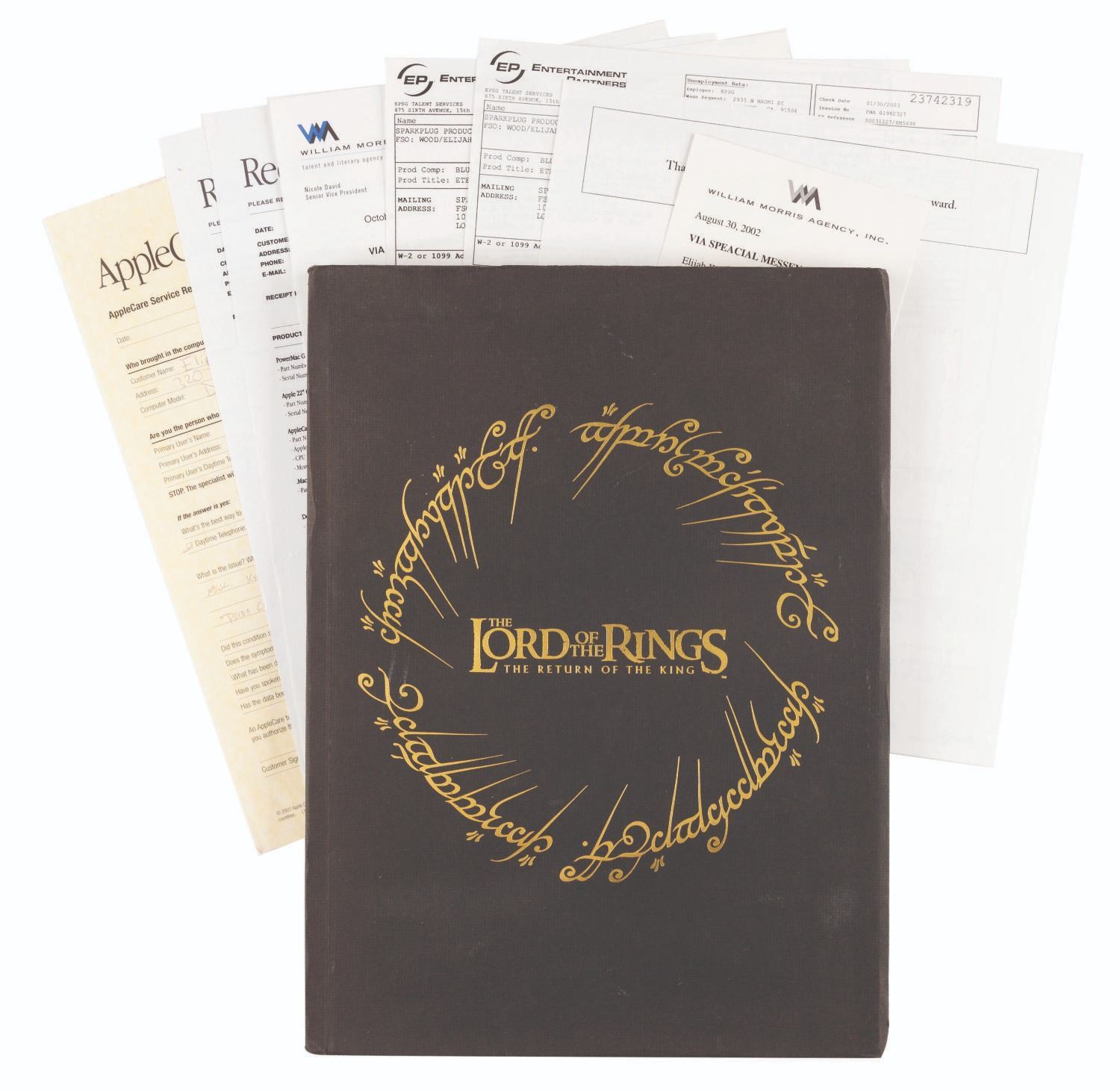 (Wood/New Line Cinema, 2002-2003) A collection of nine documents belonging to Elijah Wood and a hardcover The Lord of the Rings: The Return of the King - A Filmmaking Journey book. Included are a William Morris Agency memo regarding the script for "Stay,” and another regarding "He Dreams Awake,” an AppleCare service repair request bearing Wood’s signature in graphite, a two-page Apple receipt, a Capital One Cash Back reward letter addressed to his mother Debra Wood, an American Airlines boarding pass stub, and two printed paystubs for work on "Eternal Sunshine of the Spotless Mind.” Ranging in size from the 2.25” x 3.25” boarding pass stub to the 9.25” x 12.75” book, the paper documents and book are in good to very good condition with light creases, folds, wear, scuffs, and separation at the spine.