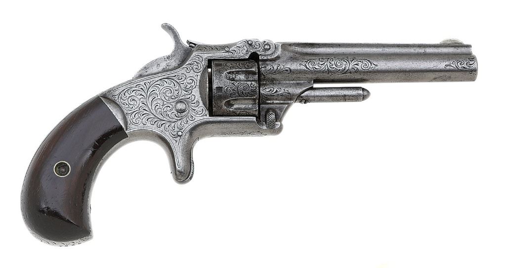 serial #7240, 22 RF, 3 3/16'' barrel with a bright good bore showing scattered pitting and strong rifling throughout. This Third Issue has toned entirely to an even gunmetal patina, showing scattered fine pinprick pitting and light oxidation staining throughout and minimal handling wear relative to its age. It has been adorned with elegant, light foliate scroll engraving along the flanks and gripstrap with additional flourish on the belly and just forward of the hinge, and all forms have been skillfully rendered in a more slender and delicate style than is typical of New York-style engraving. The smooth rosewood grip panels remain excellent, showing only scattered light handling wear and a few flecks of discoloration typical of their age and fitting nicely throughout. The barrel marking remains crisp and excellent with only the last character showing any softening, and timing and lockup appear sound with the cylinder exhibiting noticeable play when at rest. A charming Third Issue. (26B10826-294) {ANTIQUE} [Dr. W. Lloyd Hudson Jr. Collection] (800/1200)