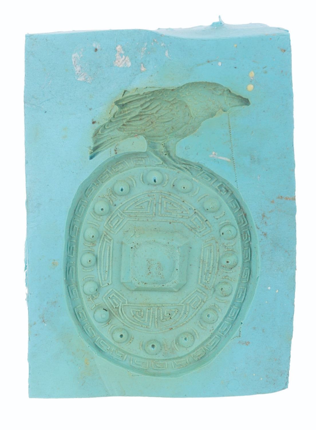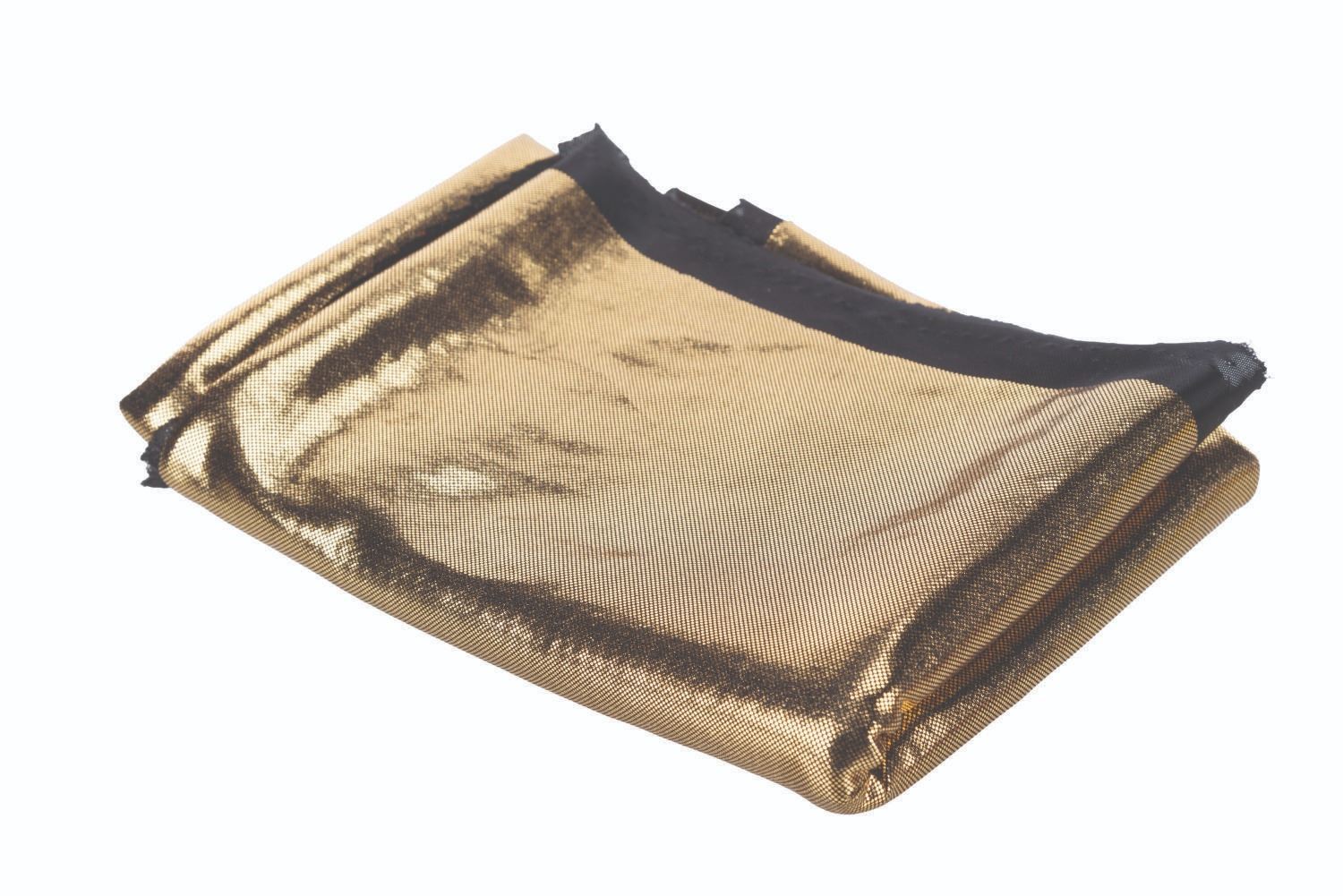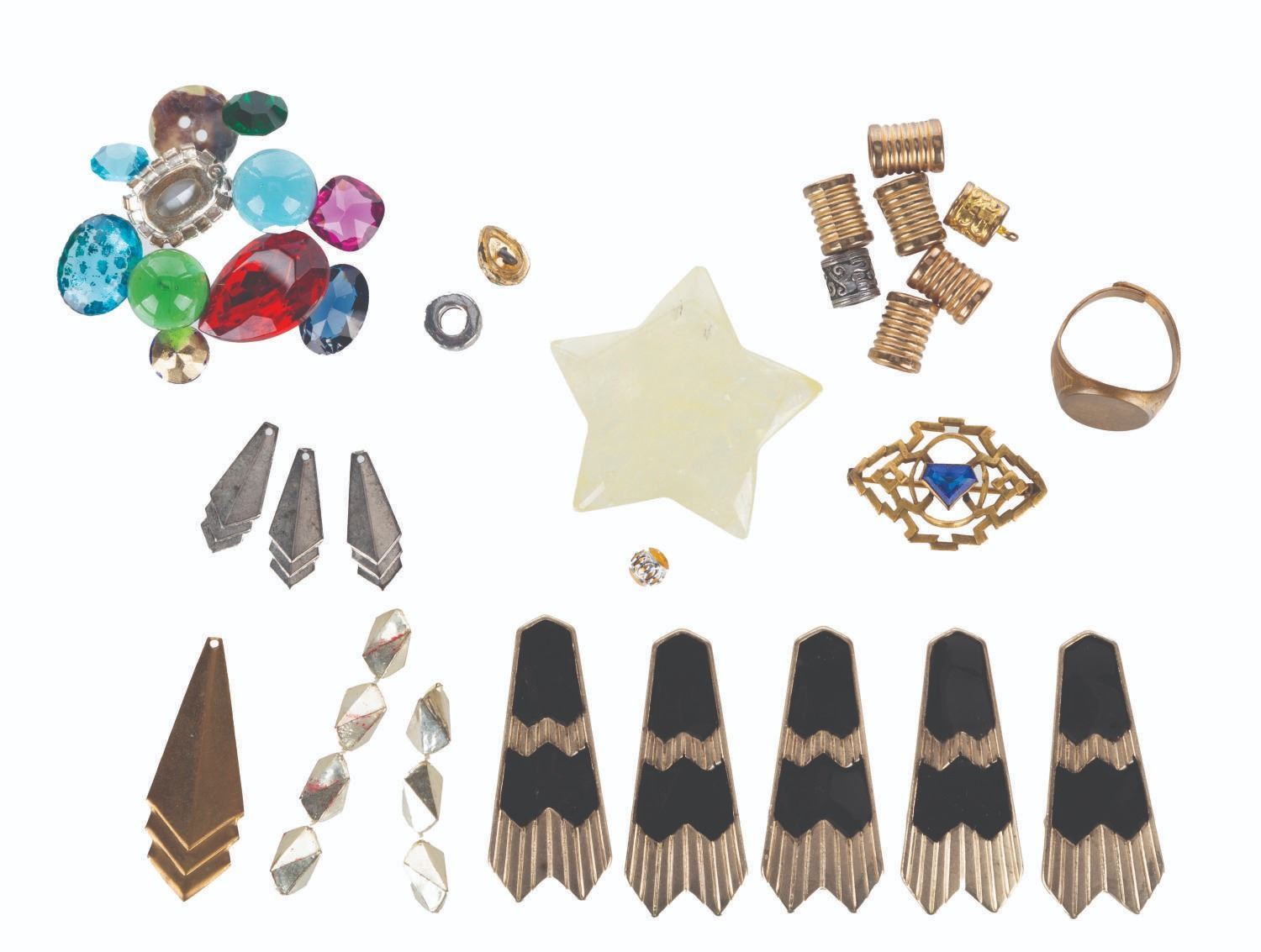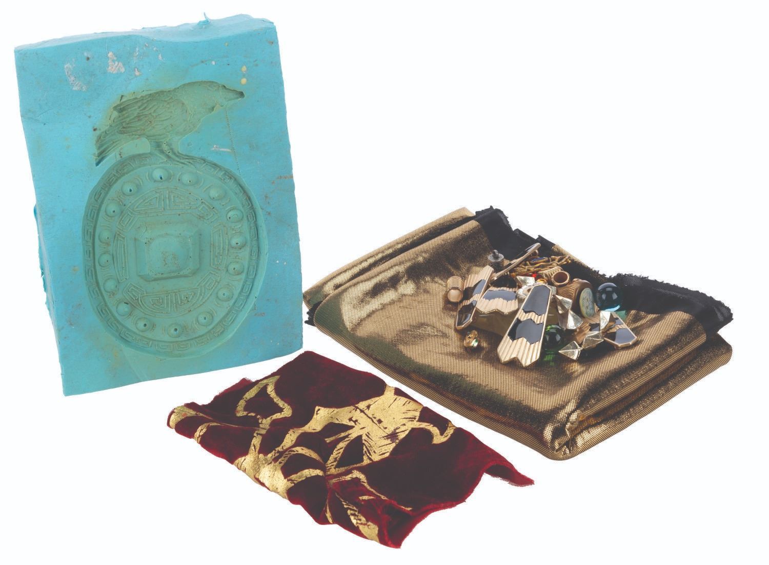 (Warner Bros., 2012) A collection of props and materials used for Erebor treasure from the production of The Hobbit trilogy. Included are 34 pieces of metal and plastic costume jewelry, a silicone treasure mold, a section of elven fabric, and gold-colored fabric used as a base layer for treasure piles. Ranging in size from a 0.25” x 0.25” x 0.25” piece of costume jewelry to the 47.5” x 9.25” section of gold fabric, the items are in good to very good condition with light soiling from production use.