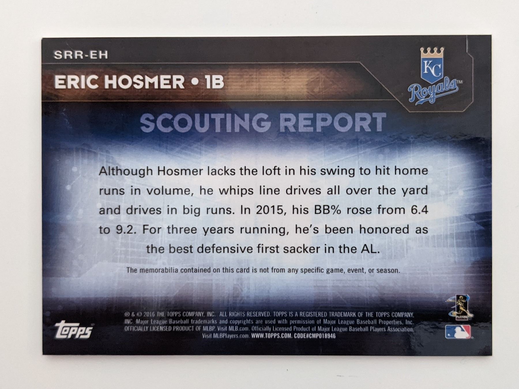 Eric Hosmer Baseball Trading Card with Game Used Jersey Swatch - Topps Scouting Report 2016