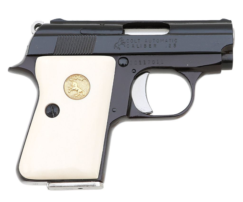 serial #0D117012, 25 ACP, 2 1/4'' barrel with a bright excellent bore. The metal surfaces retain 99% original blue showing a couple of light handling marks. The polished surfaces on the hammer, trigger and barrel remain bright and all markings are crisp. The gun is stocked with a set of Spresser Ivory grips with gold Rampant Colt medallions that includes a certificate of authenticity from the maker and they rate excellent. The pistol has fixed sights and comes with its original factory box numbered to the gun, a set of checkered walnut grips with silver Rampant Colt medallions, and one single two-line Colt marked magazine. This gun is consecutively numbered to the following lot. (10A11712-3) {MODERN} (1000/1500)