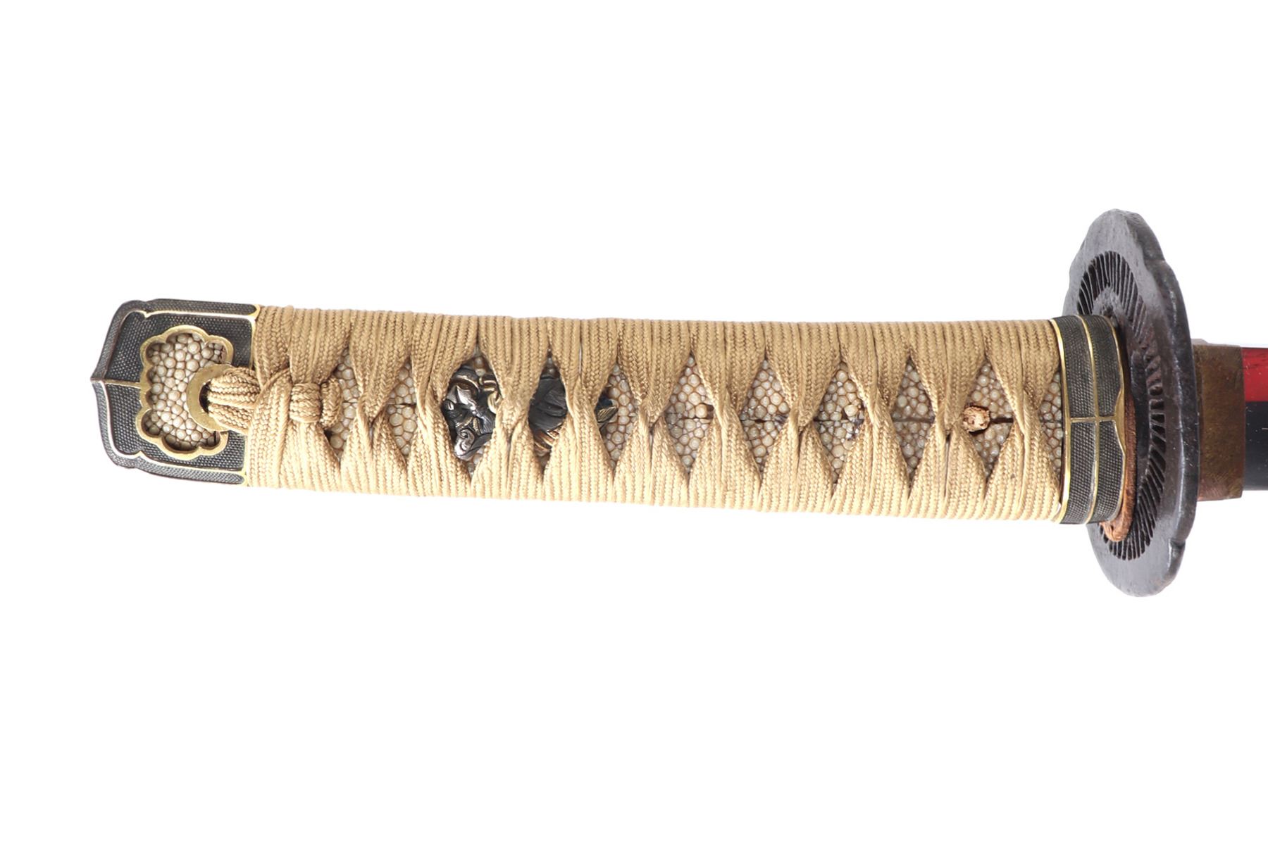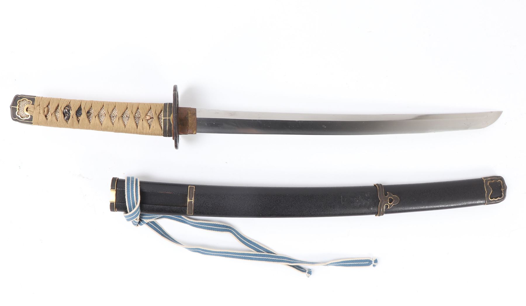 Fine Japanese Wakizashi sword and scabbard with Han-Dachi koshirae mounts. Early blade. Notable well patinated single hole tang. Single edge slightly curved with straight SUGU Hamon line. Textured scabbard with fine matching blackened textured mounts and fittings with gold gilt outlines. Iron pierced chrysanthemum openwork Mokko Gata shaped Tsuba. Excellent menuki in very fine mixed metal with silver inlaid decoration to a figures robes and face. The remainder in bronze and gold. Very good ray-skin tsuka grip very nicely wrapped in beige silk over. Wonderful set with matching mounts and menuki throughout. Size 26 1/2" L, blade 15 3/8" L, Not Signed. Condition: Good condition overall without any major blemishes or flaws. Provenance: Ex-Southern California Collection