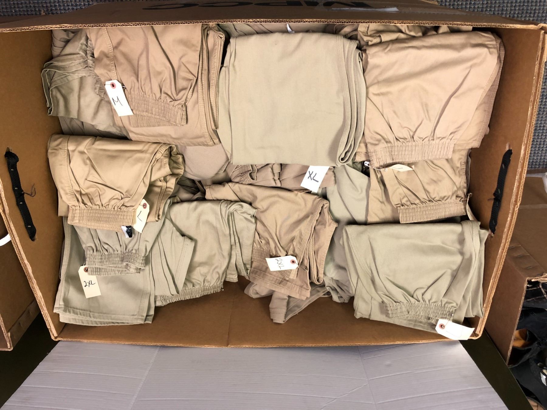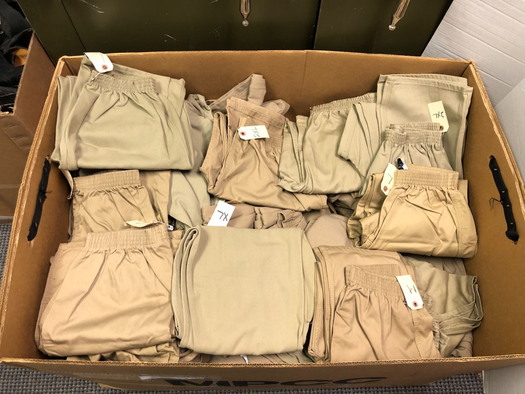 Extra Large Bin of Beige Uniform Pants (Rugby Pant Style) (These are set dec clothing that have been used in television or movie sets and have been worn or may be brand new with tags) Various Sizes Brands Include: Bob Barker and Phoenix Supply - Bin Sizes are 40 1/2in x 28 1/2in x 24in tall