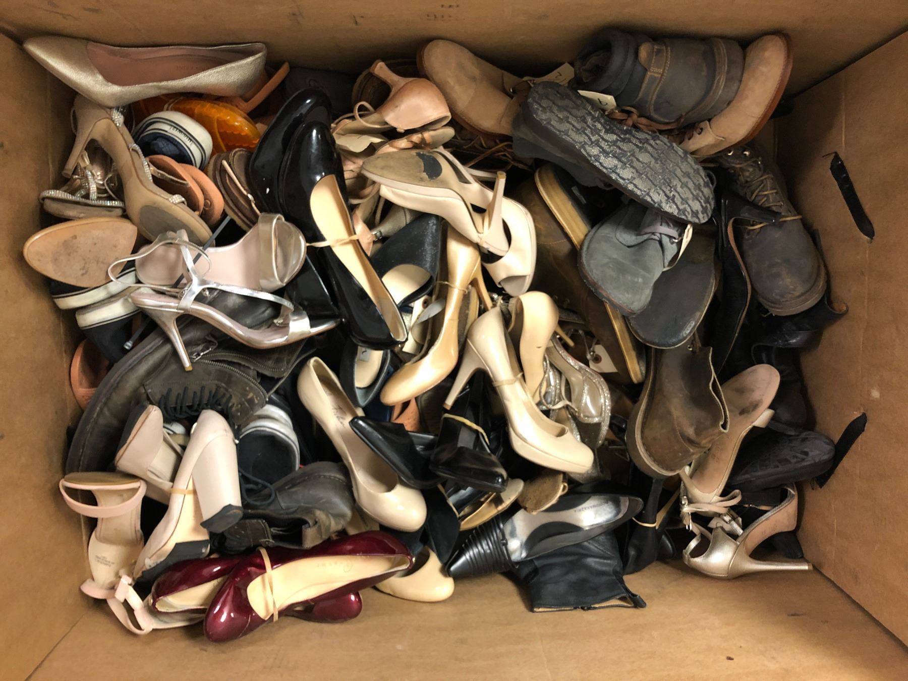 Extra Large Bin of Set Dec Shoes - Mens & Womens Includes Ivanka Trump, Flounce, Calvin Klein, Steve Madden & more. (These shoes are set dec clothing and have been used in the making of move/television shows - some in brand new with tags and others are slightly worn) Bin sizes are 40 1/2in x 28 1/2in x 24in tall - Miscellaneous sizes