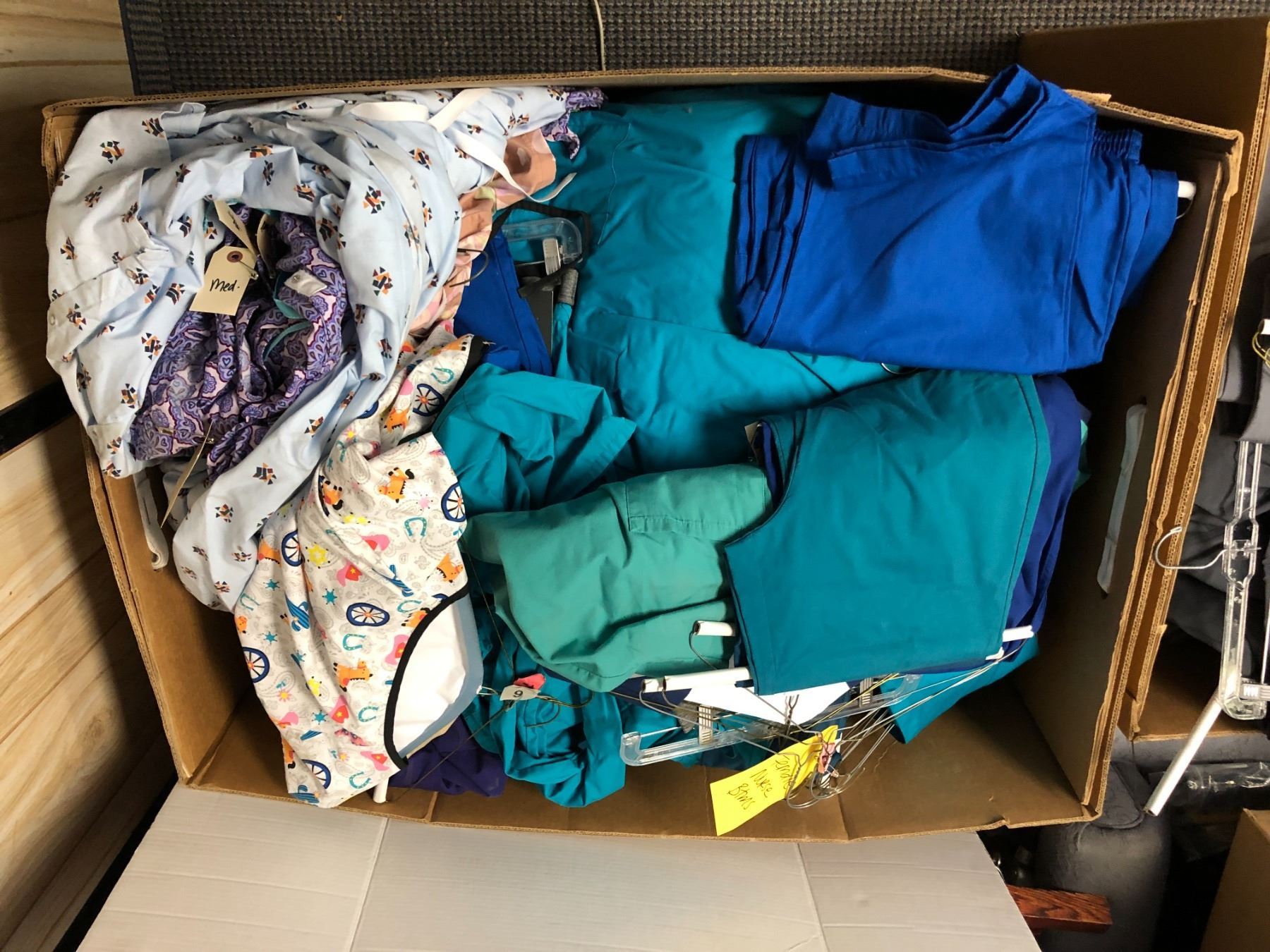 Extra Large Bin of Uniforms - Mostly Blues, Greens & Purples Hospital Scrubs Tops and Pants - Movie Set Clothing (Please Note as these items are movie set clothing they may be used or brand new with tags - various sizes and brands) Bin Sizes are 40 1/2in x 28 1/2in x 24in tall