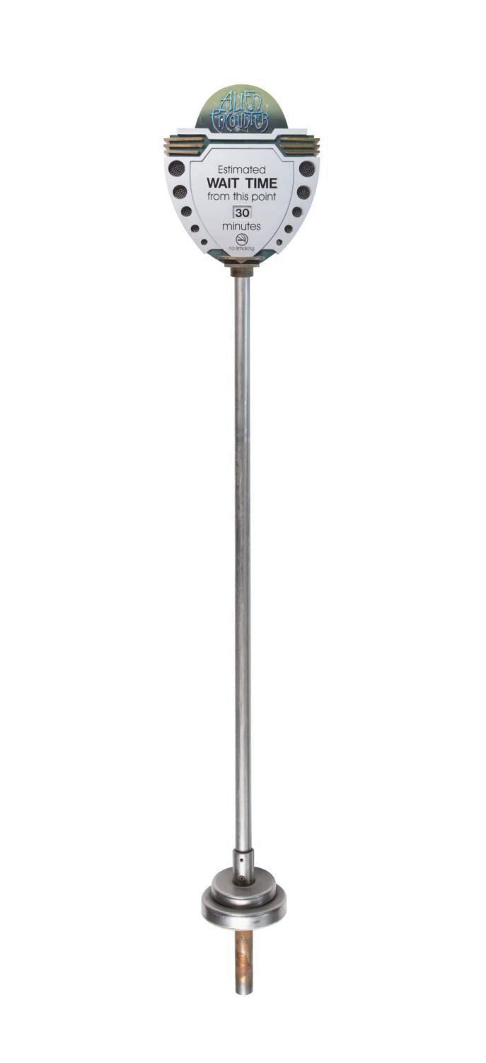 (Walt Disney World, 1995-2003) An ExtraTERRORestrial Alien Encounter wait time sign from the Magic Kingdom at Walt Disney World. The durable metal sign features an adjustable dial to inform guests of the updated wait time for navigating the Tomorrowland queue towards Alien Encounter. Measuring approximately 87" tall, the Park-used prop is in very good condition, with some scuffs and wear from outdoor display. This item may require special shipping arrangements, please inquire for details and estimates.