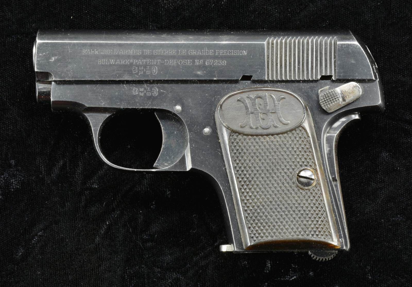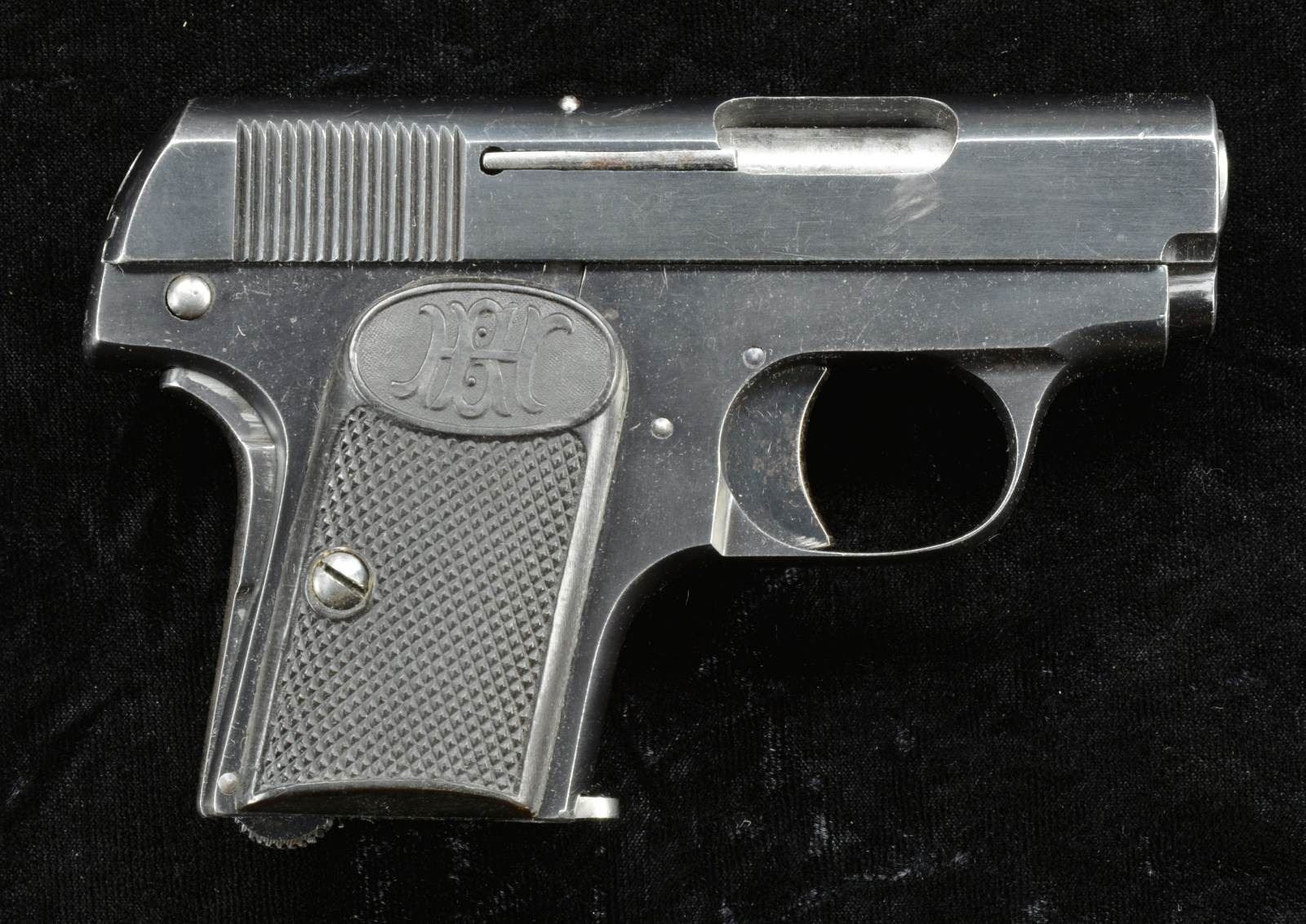 Cal. 25 ACP. S# 3436. Bbl. 2 3/16". Mfg. in Spain by Beistegui Hermanos of Eibar as patterened after Browning design. Blued w/ grip safety & checkered logo black plastic grips. MAGS: 1 plated 6 rd. CONDITION: Very good plus appearance w/ near excellent bore & grips. (22-739/NW). CURIO. $250-400.