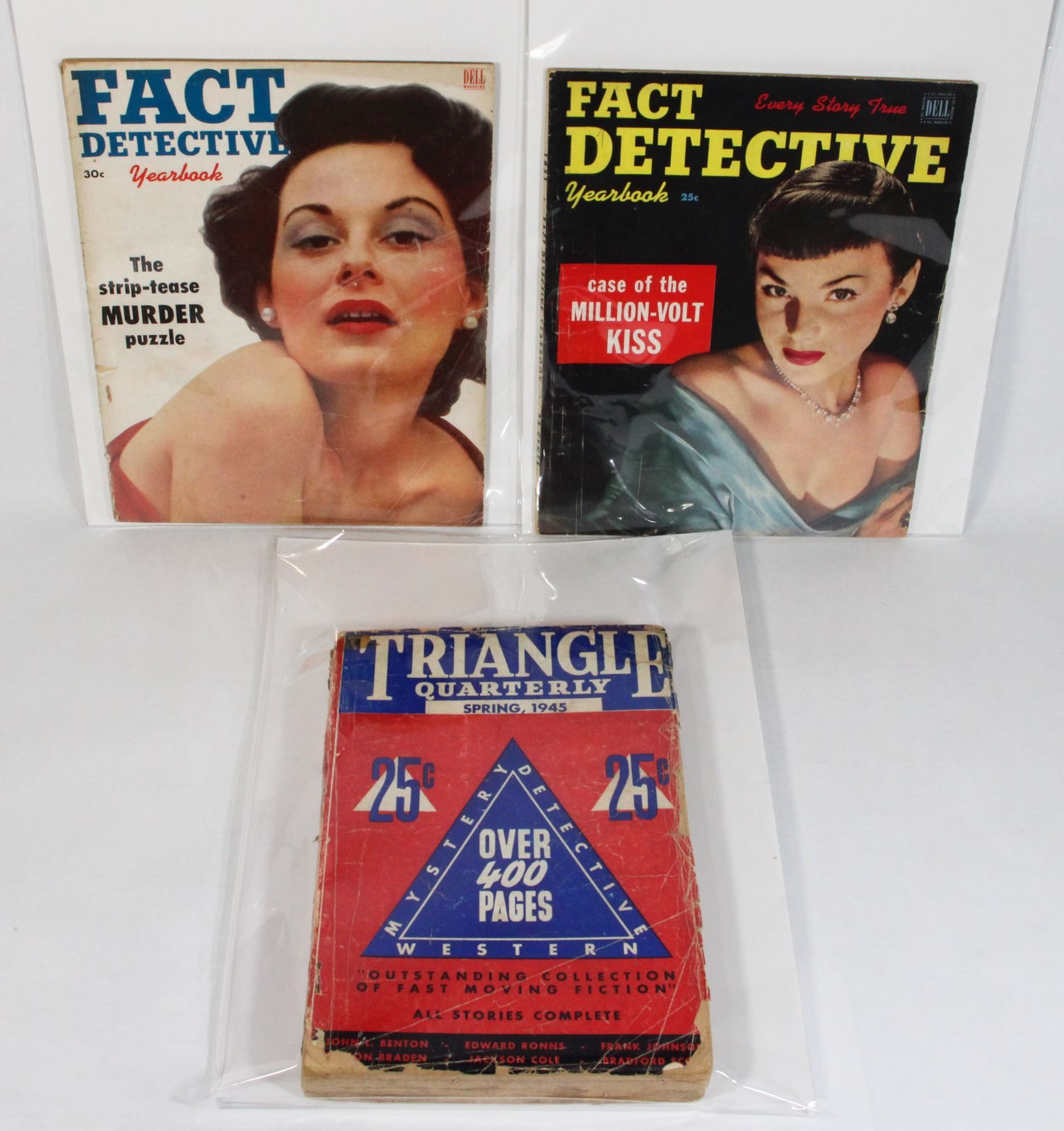 HAS SPINE WEAR FROM VINTAGE PULP FICTION DETECTIVE POLICE STORIES AND SCIENCE FICTION COLLECTION, FACT DETECTIVE YEARBOOK 1951 MAGAZINE, AND TRIANGLE QUARTERLY SPRING 1945 MAGAZINE (BACK COVER REMOVED)