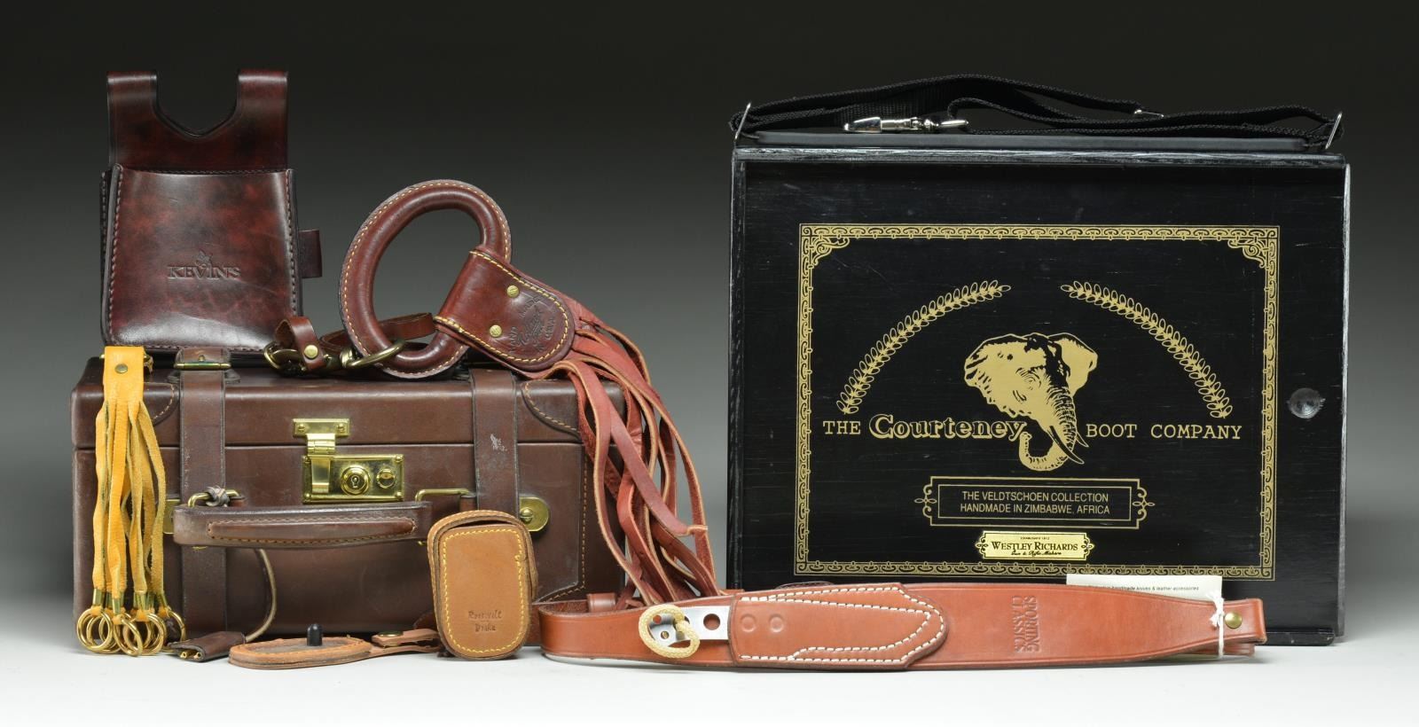 2) THE COURTNEY BOOT CO.. 15" x 12" x 7" black painted wooden box w/ label on lid reading "THE VELDTSCHOEN COLLECTION / HANDMADE IN ZIMBABWE, AFRICA". Lid also has Wesley Richards plaque. Box includes, but not limited to: owner's manual, Bakr-bilt Rifle sling, J Purdey & Sons Patridge & Pheasant counter in leather case. CONDITION: box in very good overall condition w/ wear. Contents inside appear in very good condition. PROVENANCE: From the Collection of Thomas B. Harper Jr. (02-16509/MD). $100-200.