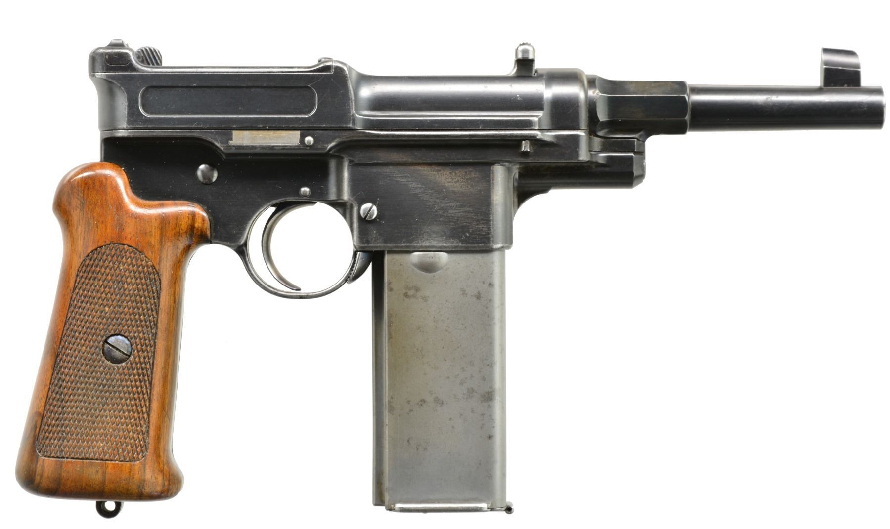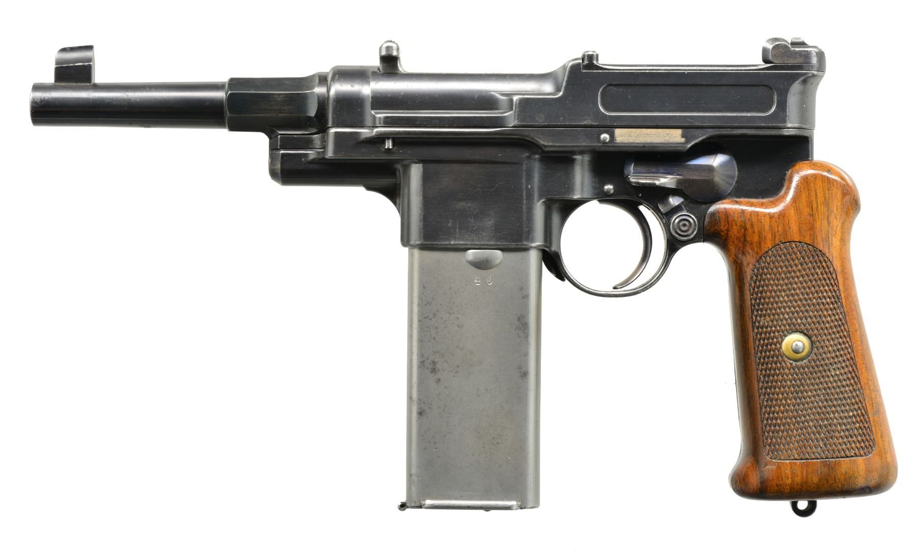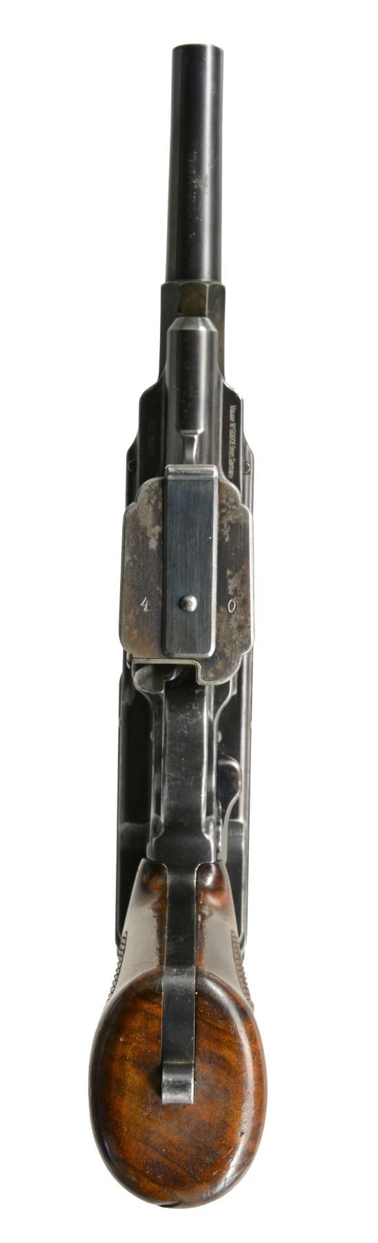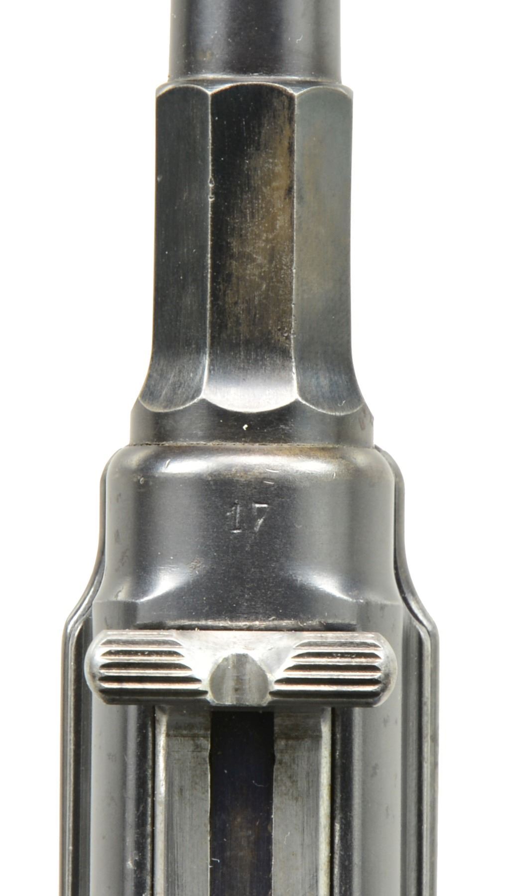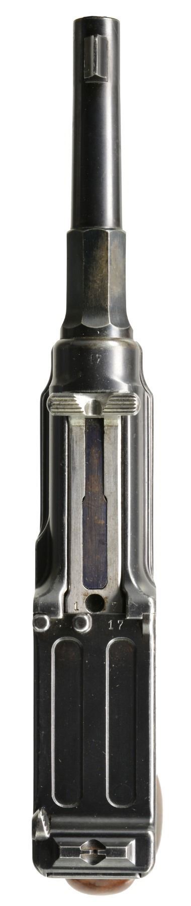 EXTENDED MAGAZINE. Cal. 9mm Mauser. S# 17. The Mauser M1906/08 was one of Mauser"s rarest and most charismatic pistols; fewer than 100 having been assembled on an experimental basis. The Mauser M1906/08 was an important developmental pistol with a flapper-locked bolt as later used in the M1915 rifle, and detachable magazine that had yet to make its appearance on any production handgun. As one might expect, there were a number of evolutionary changes in the M1908 design; this one having: a round barrel with unmarked octagonal reinforcement near the chamber, fixed front sight without a supporting barrel band, and "V" notch rear sight as part of the rear cover plate. Rotating safety lever on the left side of the frame with button release. Short magazine well, reaching to the midpoint of the trigger guard; the right side with a protruding screw head whose shaft acts as a pivot bar for the magazine release. Single piece wood checkered grip. The only markings on this pistol are the number "17" that appears on most of the major parts and the reference to bore/land/groove diameter as lightly struck under the barrel ("805. 0,12. 250."). "HI LLC Bettendorf, IA" import marked on bottom rails forward of magazine well. MAGS: 20 rd. with in-the-white body and 60% fire blued floorplate. Marked "40" on the left side of the wall and floorplate plus an inspection "11" at the bottom of the spine. Very good original condition. CONDITION: approximately 95% original blue with slight touch-up and a few tiny mars at the bottom of the hexagonal barrel extension forward of the protruding lug. Discreetly import marked using a fine laser etching method in an unobtrusive area. Comparable condition fire blued and strawed small parts; grip with most original varnish. Bright bore with light corrosion; near excellent manual functioning of mechanics. A great, early production Mauser M1906/08, well suited for the most advanced collection. PROVENANCE: From the esteemed collection of Paul Regnier, Switzerland. (20-1429/LA). CURIO. $45,000-65,000.