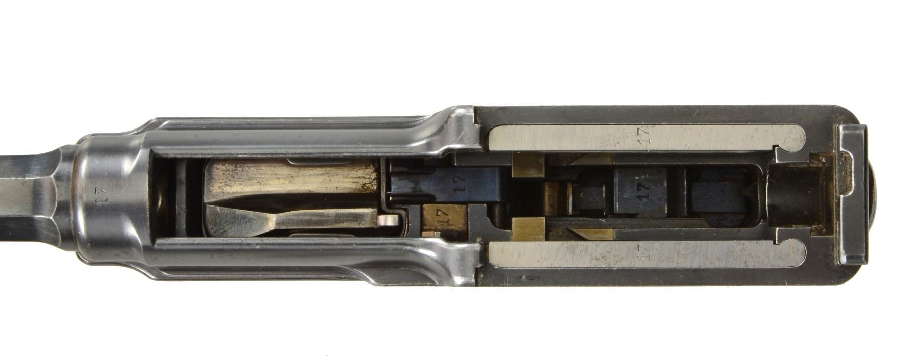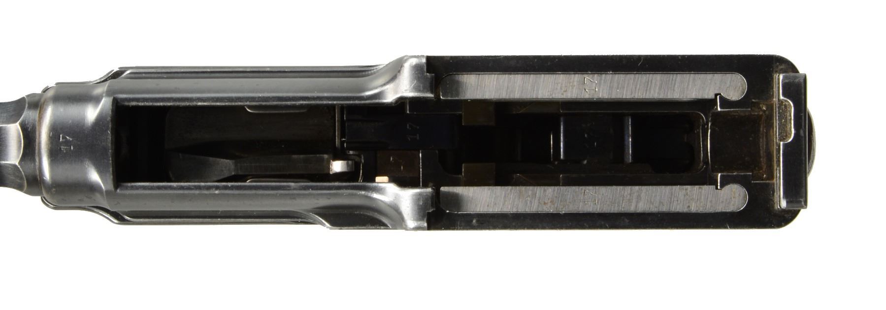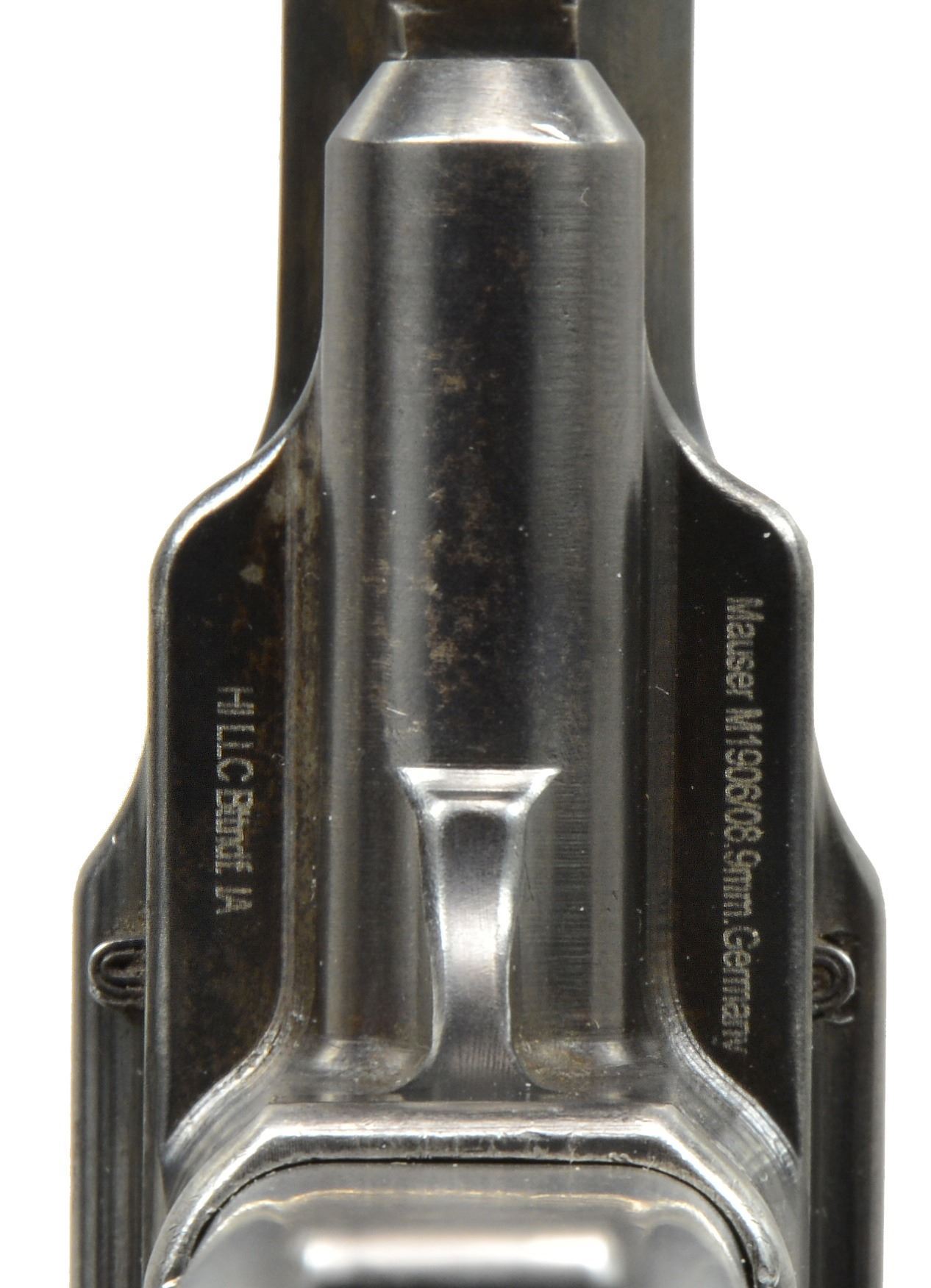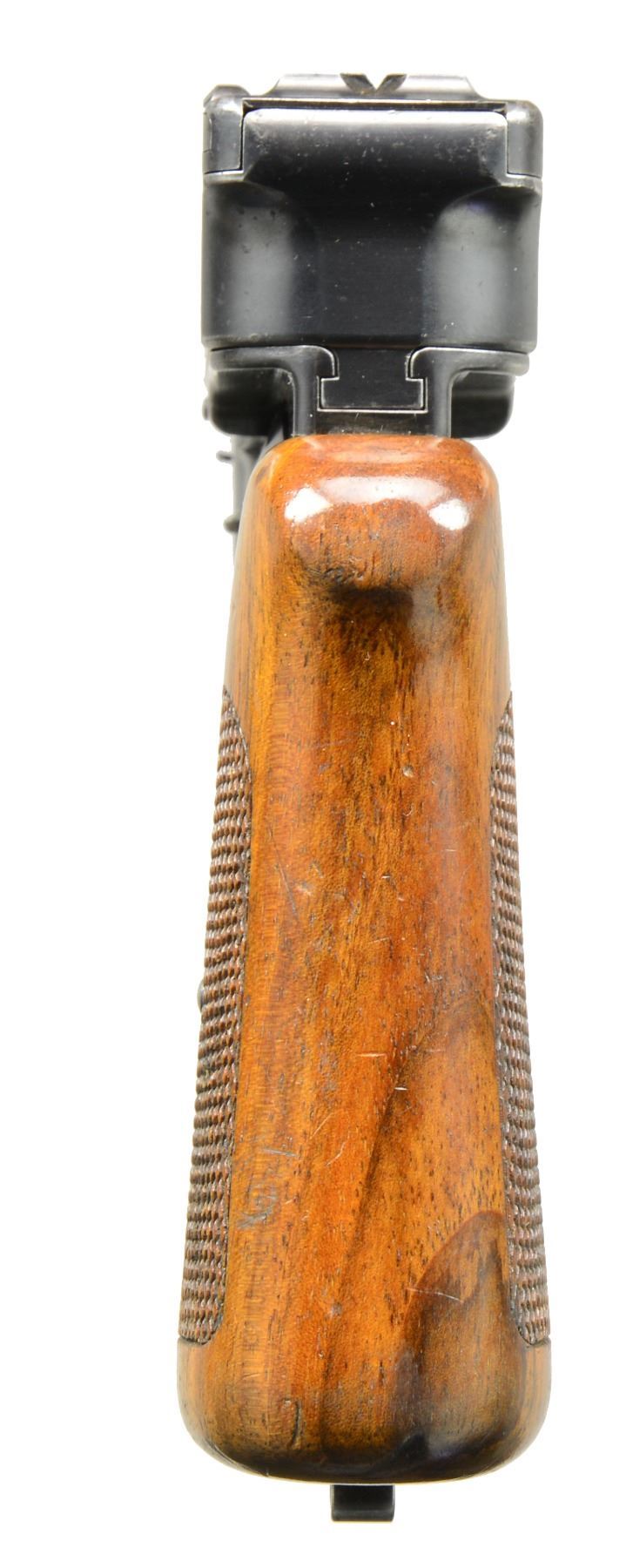 EXTENDED MAGAZINE. Cal. 9mm Mauser. S# 17. The Mauser M1906/08 was one of Mauser"s rarest and most charismatic pistols; fewer than 100 having been assembled on an experimental basis. The Mauser M1906/08 was an important developmental pistol with a flapper-locked bolt as later used in the M1915 rifle, and detachable magazine that had yet to make its appearance on any production handgun. As one might expect, there were a number of evolutionary changes in the M1908 design; this one having: a round barrel with unmarked octagonal reinforcement near the chamber, fixed front sight without a supporting barrel band, and "V" notch rear sight as part of the rear cover plate. Rotating safety lever on the left side of the frame with button release. Short magazine well, reaching to the midpoint of the trigger guard; the right side with a protruding screw head whose shaft acts as a pivot bar for the magazine release. Single piece wood checkered grip. The only markings on this pistol are the number "17" that appears on most of the major parts and the reference to bore/land/groove diameter as lightly struck under the barrel ("805. 0,12. 250."). "HI LLC Bettendorf, IA" import marked on bottom rails forward of magazine well. MAGS: 20 rd. with in-the-white body and 60% fire blued floorplate. Marked "40" on the left side of the wall and floorplate plus an inspection "11" at the bottom of the spine. Very good original condition. CONDITION: approximately 95% original blue with slight touch-up and a few tiny mars at the bottom of the hexagonal barrel extension forward of the protruding lug. Discreetly import marked using a fine laser etching method in an unobtrusive area. Comparable condition fire blued and strawed small parts; grip with most original varnish. Bright bore with light corrosion; near excellent manual functioning of mechanics. A great, early production Mauser M1906/08, well suited for the most advanced collection. PROVENANCE: From the esteemed collection of Paul Regnier, Switzerland. (20-1429/LA). CURIO. $45,000-65,000.