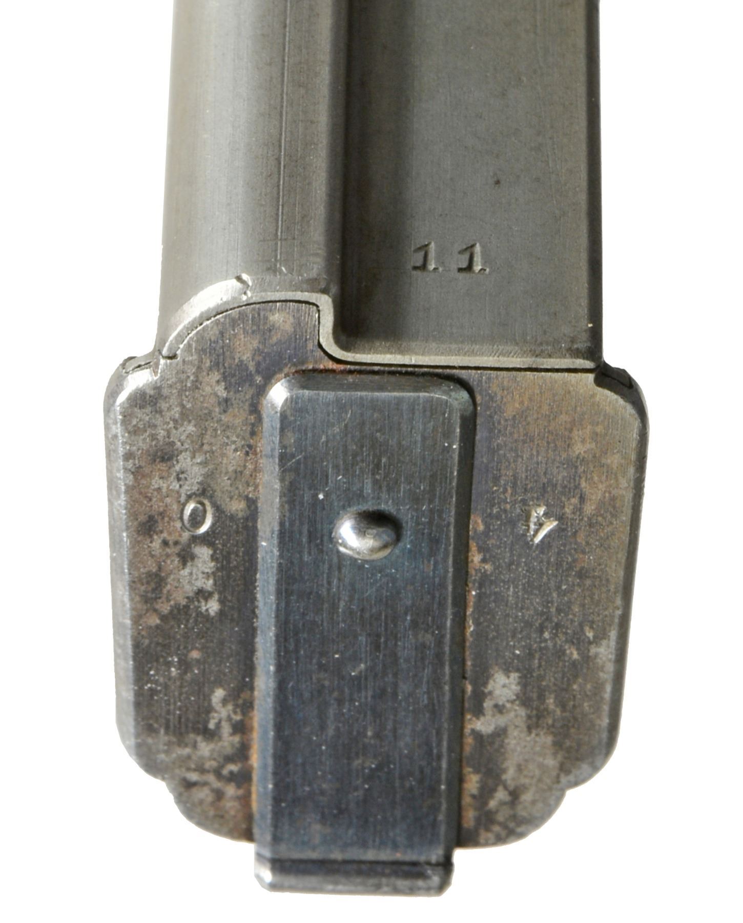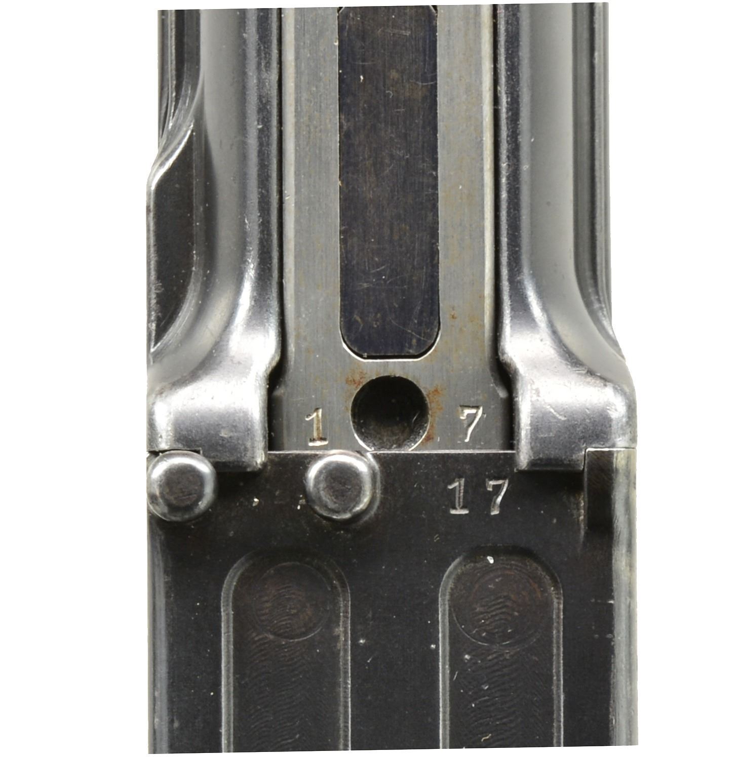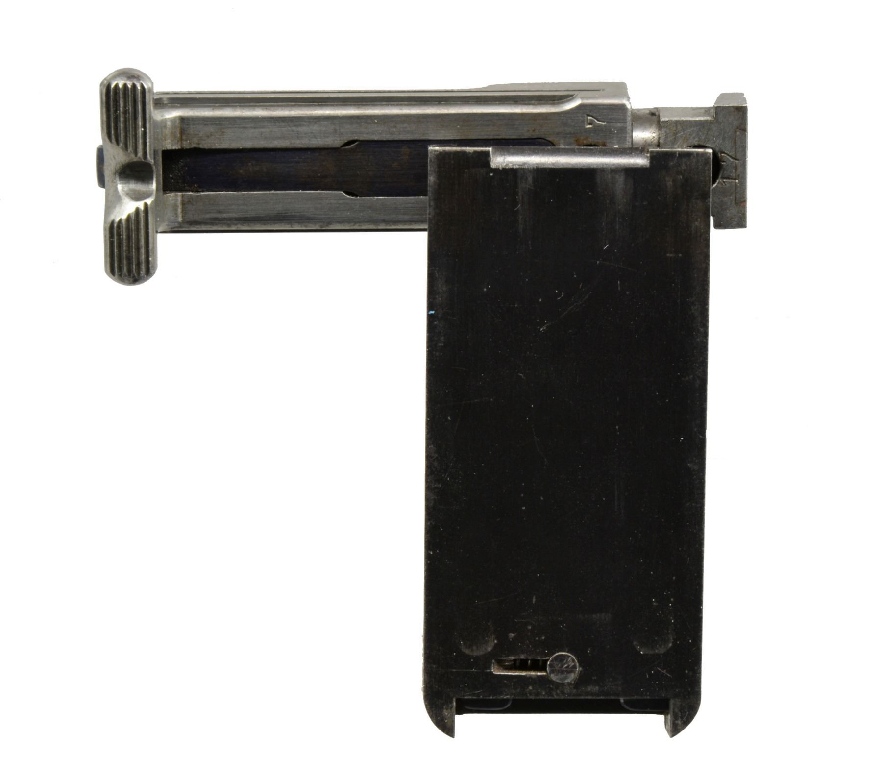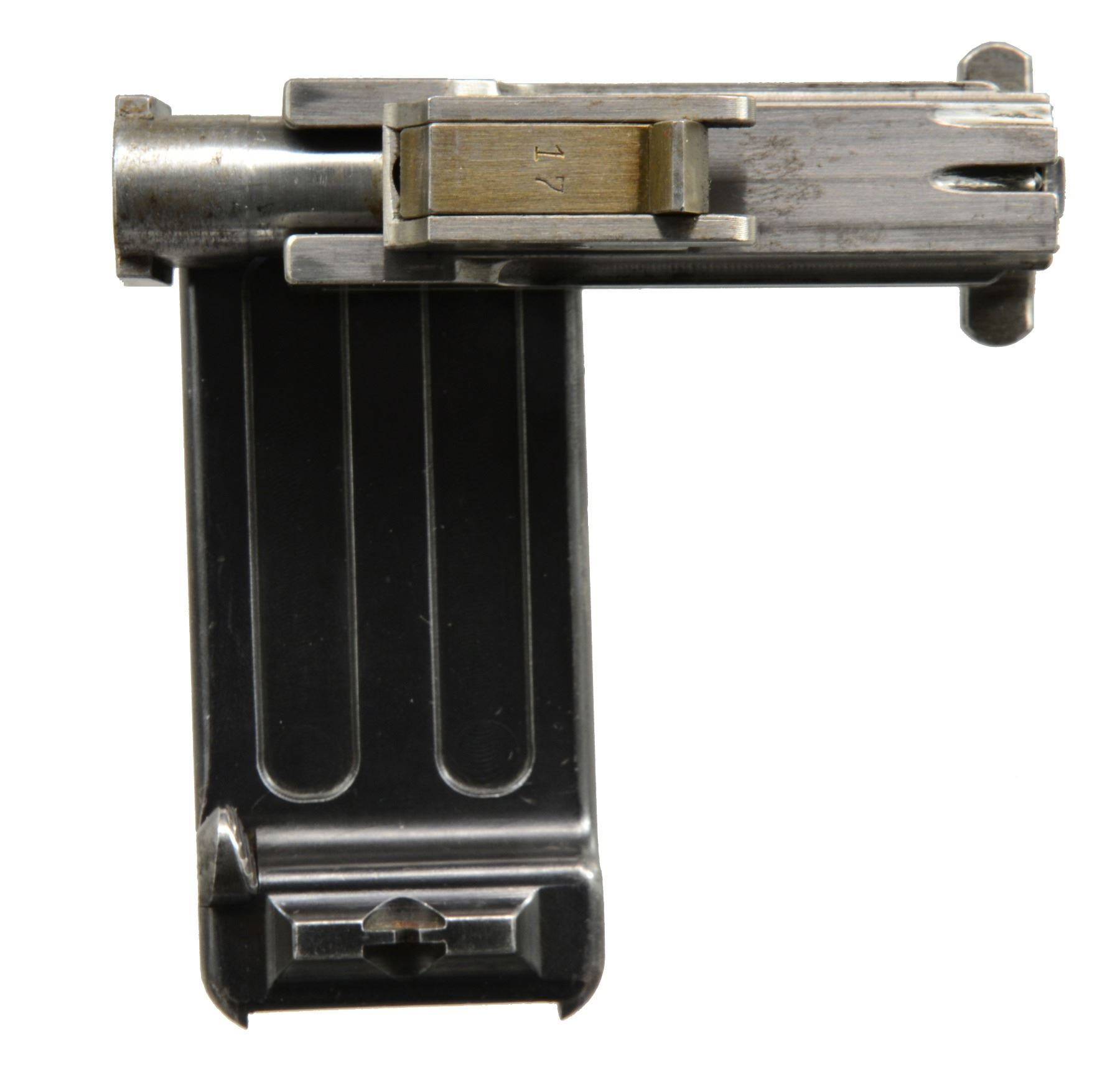 EXTENDED MAGAZINE. Cal. 9mm Mauser. S# 17. The Mauser M1906/08 was one of Mauser"s rarest and most charismatic pistols; fewer than 100 having been assembled on an experimental basis. The Mauser M1906/08 was an important developmental pistol with a flapper-locked bolt as later used in the M1915 rifle, and detachable magazine that had yet to make its appearance on any production handgun. As one might expect, there were a number of evolutionary changes in the M1908 design; this one having: a round barrel with unmarked octagonal reinforcement near the chamber, fixed front sight without a supporting barrel band, and "V" notch rear sight as part of the rear cover plate. Rotating safety lever on the left side of the frame with button release. Short magazine well, reaching to the midpoint of the trigger guard; the right side with a protruding screw head whose shaft acts as a pivot bar for the magazine release. Single piece wood checkered grip. The only markings on this pistol are the number "17" that appears on most of the major parts and the reference to bore/land/groove diameter as lightly struck under the barrel ("805. 0,12. 250."). "HI LLC Bettendorf, IA" import marked on bottom rails forward of magazine well. MAGS: 20 rd. with in-the-white body and 60% fire blued floorplate. Marked "40" on the left side of the wall and floorplate plus an inspection "11" at the bottom of the spine. Very good original condition. CONDITION: approximately 95% original blue with slight touch-up and a few tiny mars at the bottom of the hexagonal barrel extension forward of the protruding lug. Discreetly import marked using a fine laser etching method in an unobtrusive area. Comparable condition fire blued and strawed small parts; grip with most original varnish. Bright bore with light corrosion; near excellent manual functioning of mechanics. A great, early production Mauser M1906/08, well suited for the most advanced collection. PROVENANCE: From the esteemed collection of Paul Regnier, Switzerland. (20-1429/LA). CURIO. $45,000-65,000.