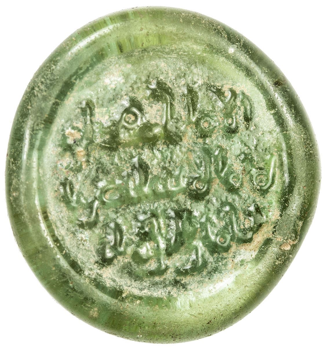 FATIMID: al-Mustansir, 1036-1094, glass weight or jeton (2.94g), A-724, FGJ-262, 3-line legend with the Imam 's name & titles; green, slightly bluish, translucent, almost perfectly preserved, EF, R.