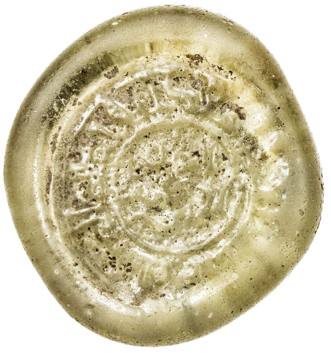 FATIMID: al-Mustansir, 1036-1094, glass weight or jeton (2.98g), A-724, FGJ-298, amir / al- 'mu 'minin in the center, Imamate legend around; light gray, translucent, shallow legends, VF.
