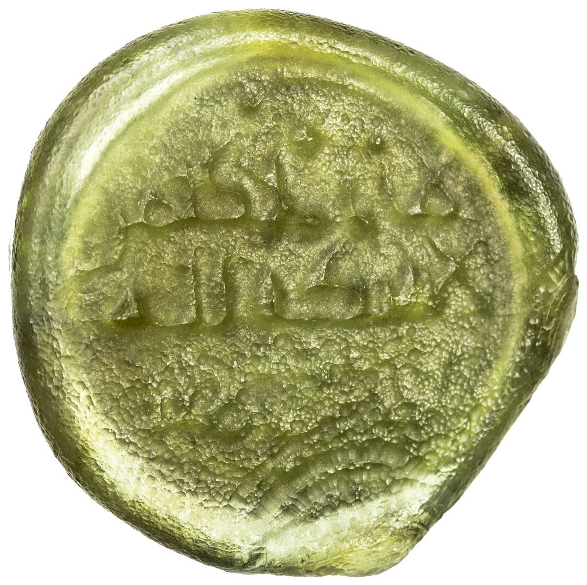 FATIMID: al-Zahir, 1021-1036, glass weight or jeton (1.69g), A-718, FGJ-195, Imam 's name & title is 3-line legend, much porosity, mainly at the lower area of the obverse and on the reverse, Fine.