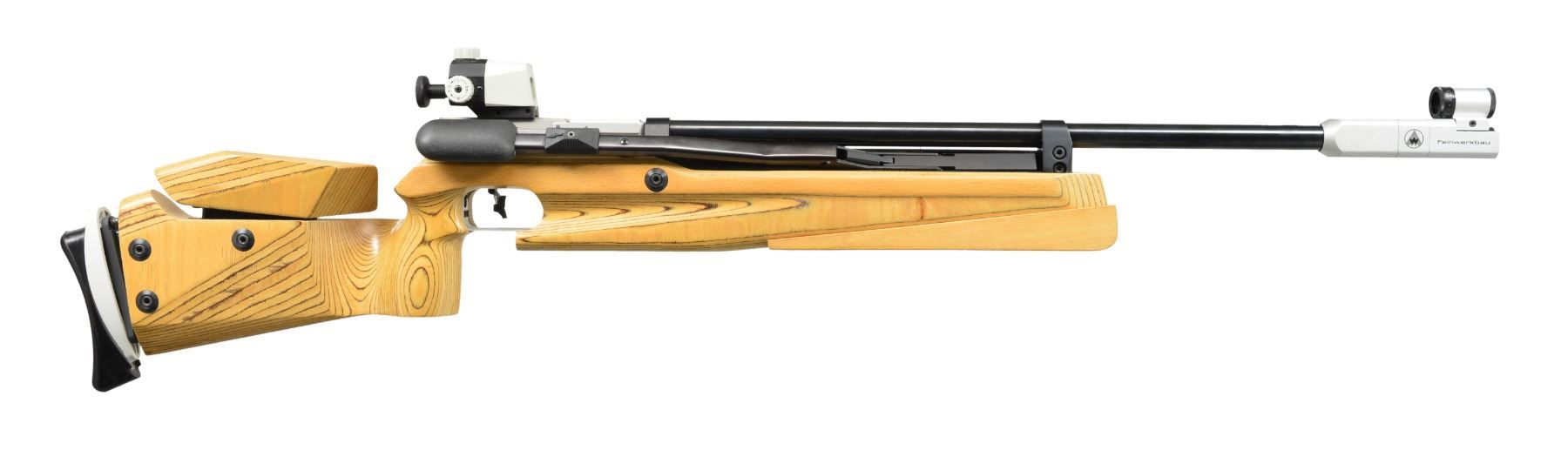 Cal. 177 / 4.5mm. 585 FPS. S# 213066. Bbl. 16 3/4". Side lever cocking spring piston action. Flip up loading port. Globe front sight mounted on muzzle weight w/ match grade adj. diopter rear sight. Adj. trigger. Laminate match grade stock w/ adj. comb, forearm & recoil pad. Left side of forearm has ID plate "Alfred Meyer / Wolfenbuttel". Mfg. in Germany. CONDITION: 98% wood & metal finish. Very good bore. Action has good compression. (02-13461/DS). NON-GUN. $500-700.