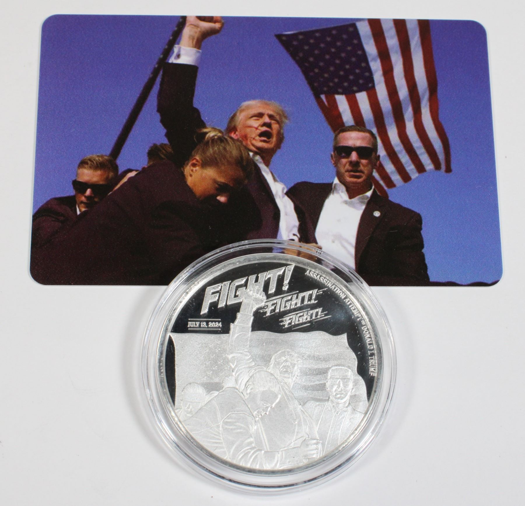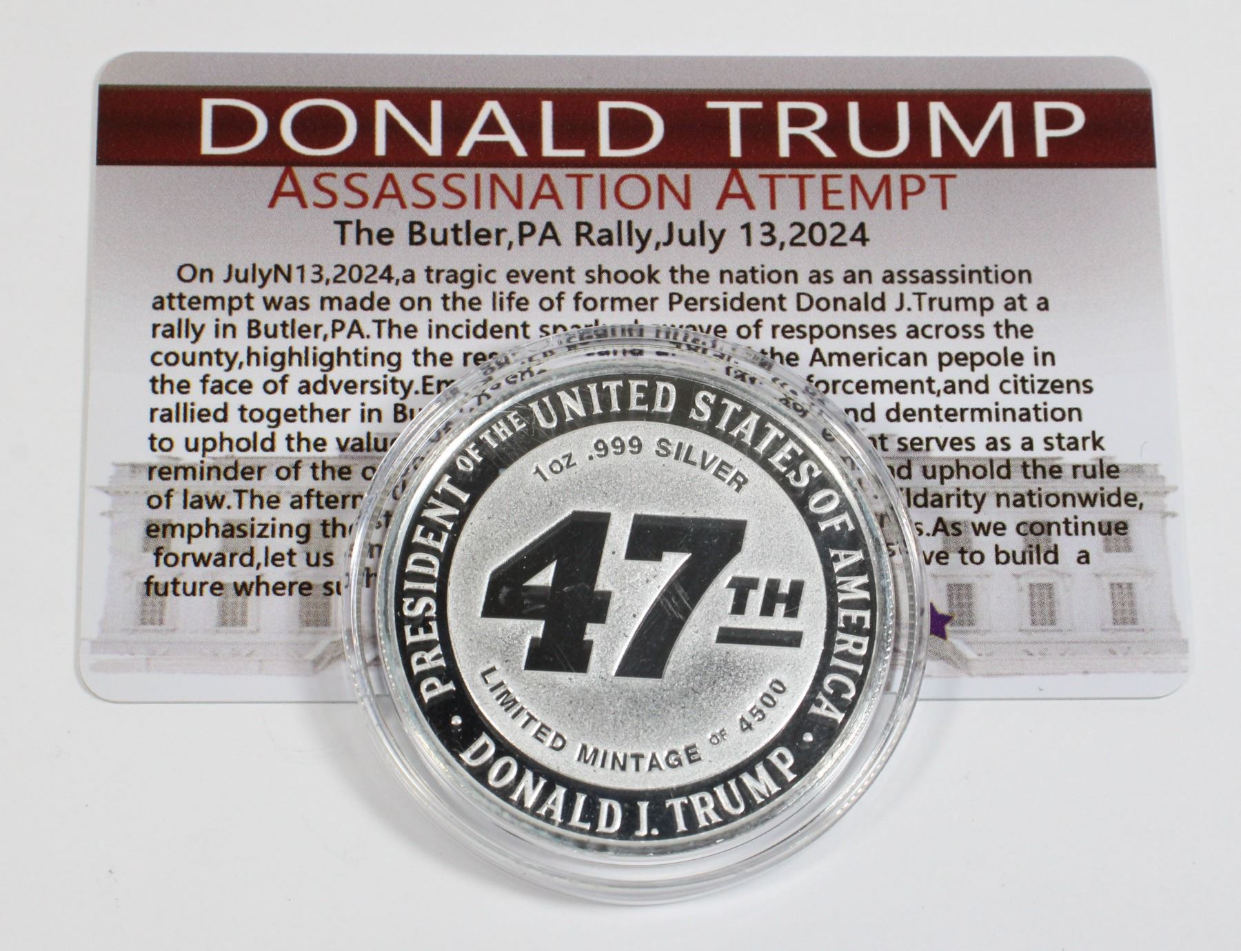 LIMITED EDITION OF 4,500 PIECES. SOLD OUT WITHIN A WEEK. PROOF LIKE FINISH. COMES WITH TRUMP ASSASSINATION ATTEMPT HARD PLASTIC COMMEMORATIVE CARD