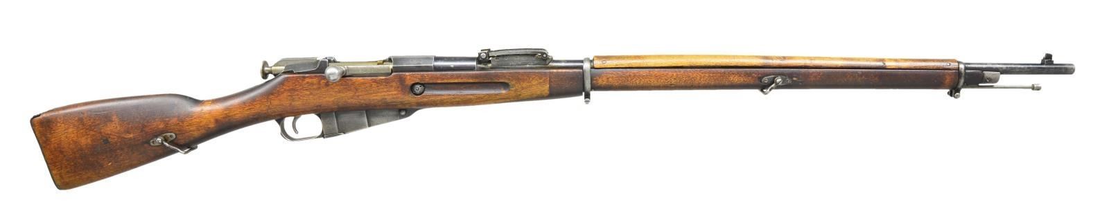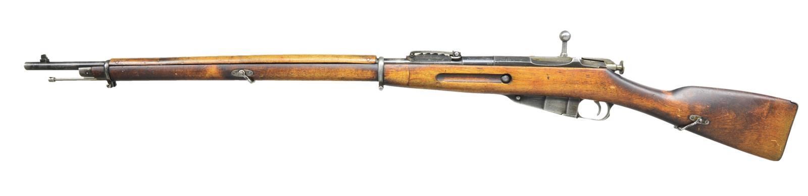 REBUILT AT VKT ARSENAL. Cal. 7.62x54R. S#. 16373. S# matches on receiver, bbl. & bolt. Bbl. 31 1/2". Import mark on right side of bbl. Hexagonal receiver has notable machine marks on top flat obscuring Imperial eagle marking. Bolt has been renumbered to match rifle. Safety has pre 1928 "IZHEVSK" marking. Replacement bbl. is marked on top w/ "VKT" logo "D" & "1941" marked on left side w/ "SA" Finnish property mark. Original ladder rear sight remarked for Finnish use. Front sight is tall, stepped Finnish blade. Cleaning rod is present. Clamping bbl. bands. 2 piece stock w/ finger joint construction & Finnish style stirrup swivels. CONDITION: arsenal rework finish has wear, staining & handling marks throughout. Metal has thinning arsenal rework blue w/ wear & handling marks. Good bore w/ lightly frosted appearance & lightly worn lands. (22-701/RW). CURIO. $300-400.