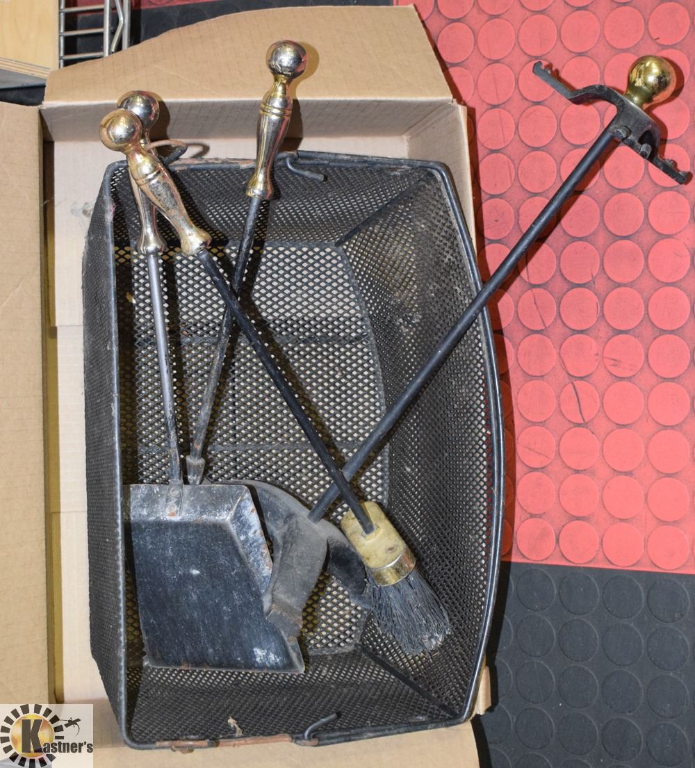 3 CAST IRON FIREPLACE TOOL SET + WIRE KINDLING BOX WITH HANDLE