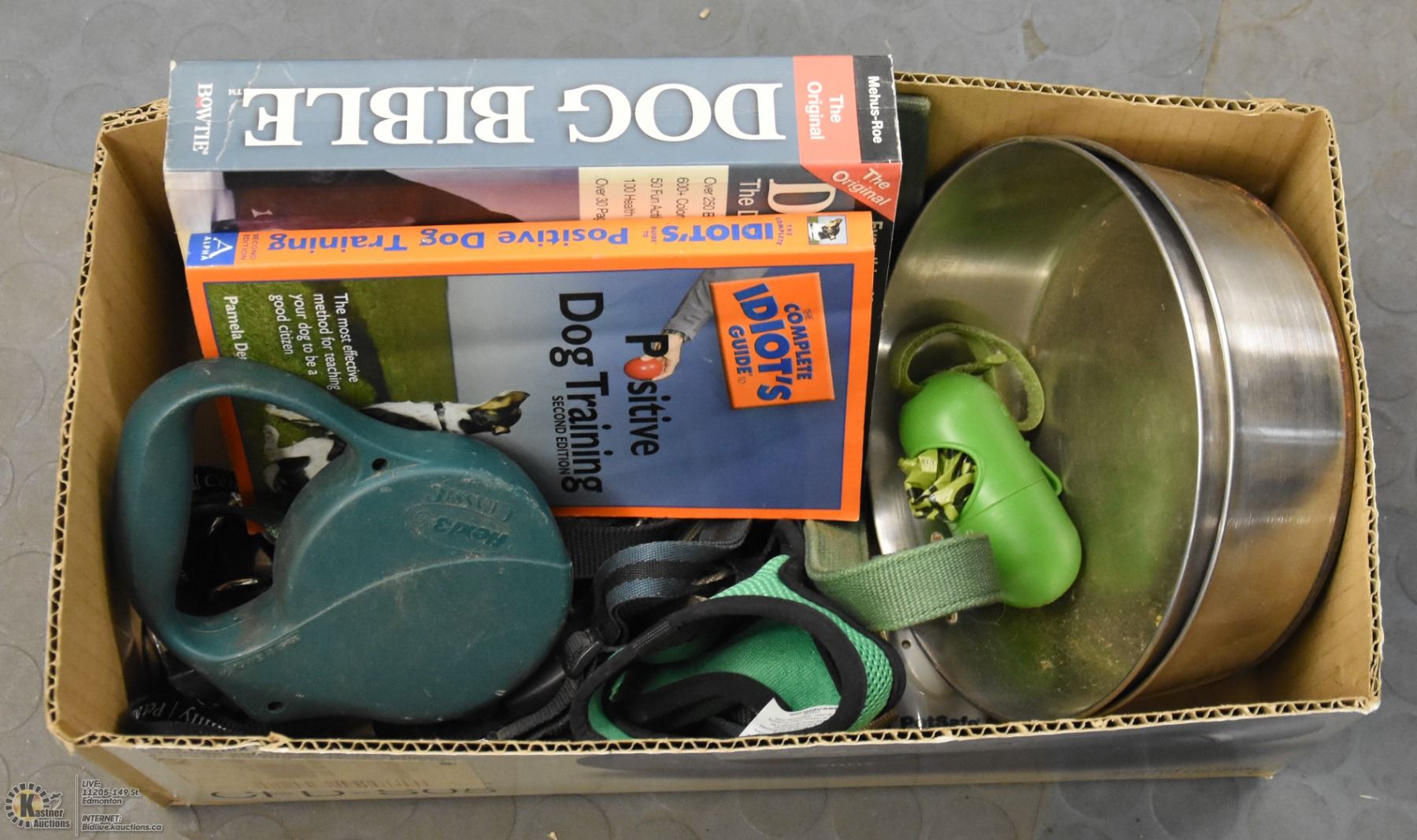 FLAT INCLUDES DOG DISHES, COLLARS, RETRACTABLE LEASH, LEASHES, POOP BAGS, AND BOOKS