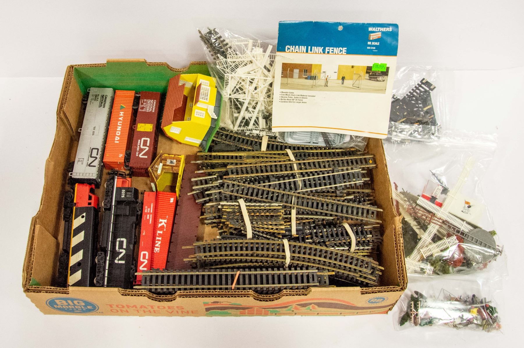 TRACKS, TRAINS CN, TREES, PEOPLE, OTHER ACCESSORIES FENCES, CHAIN LINK FENCE (SEALED) SOME ARE LABELLED BACHMAN