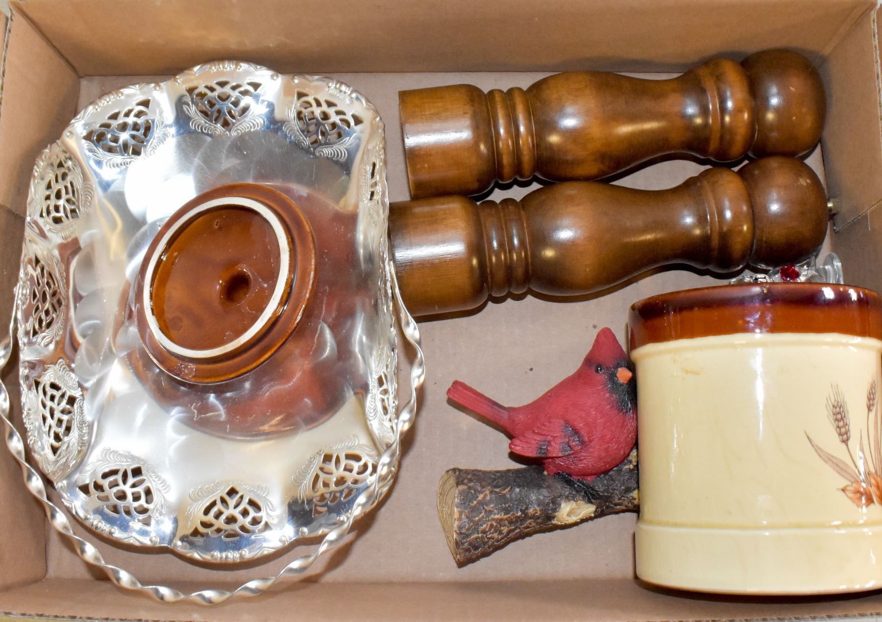 FLAT OF CROCK W/ GERMAN WOOD SALT/PEPPER SHAKERS