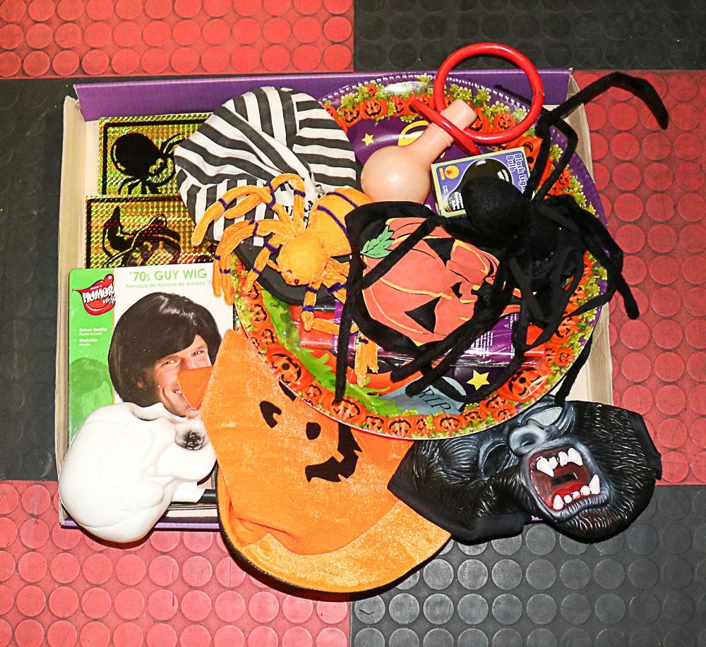 FLAT OF HALLOWEEN ITEMS,MOSTLY NEW,WIG,BLACK BULB