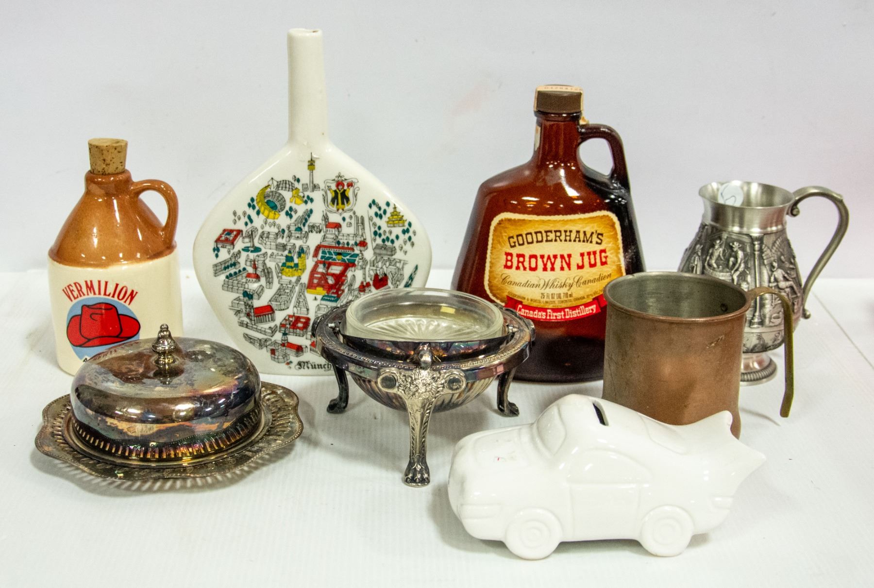 FLAT OF MAN CAVE ITEMS CROCK, DECANTER, PEWTER &