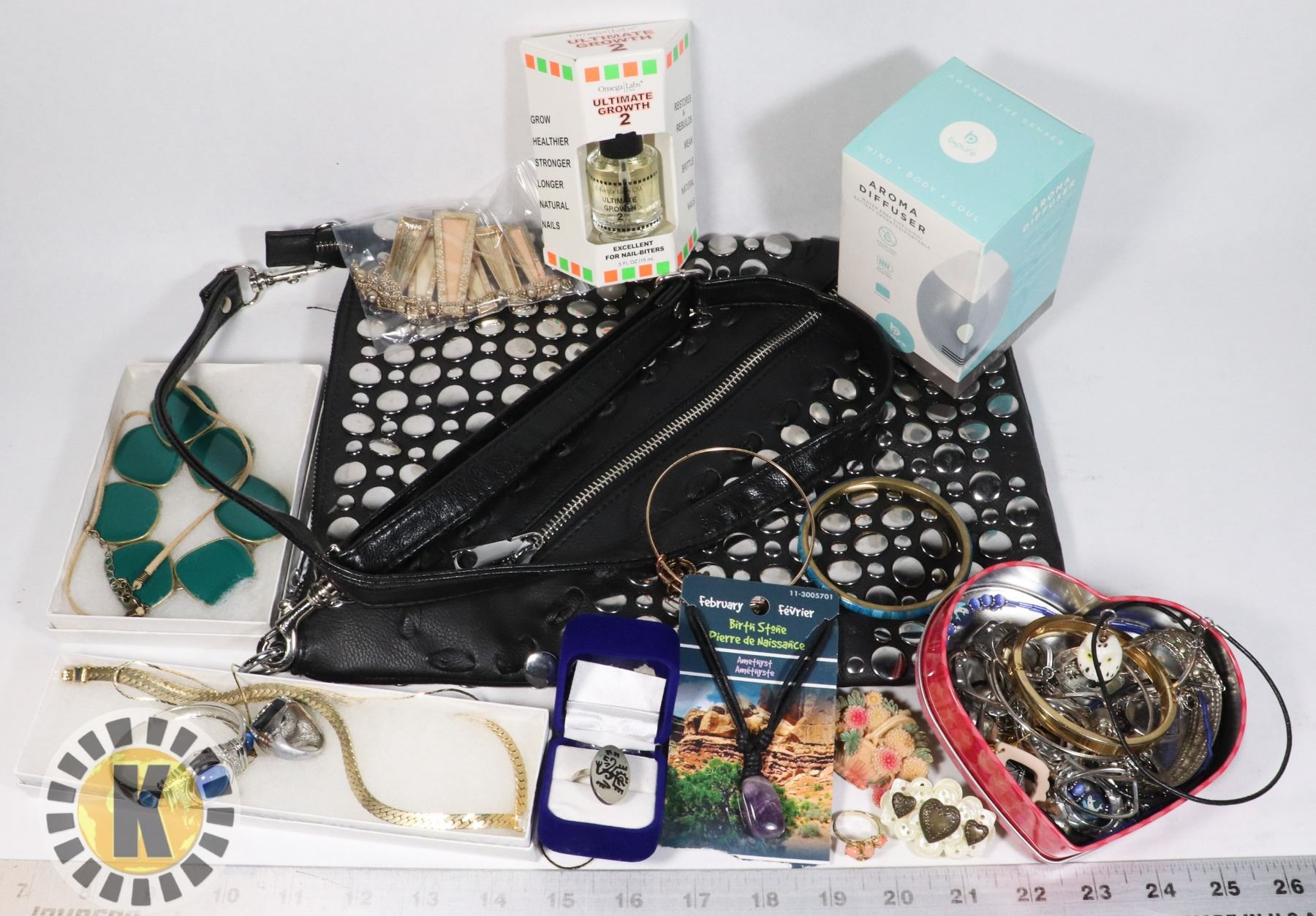 FLAT OF WOMENS ASSORTED JEWELRY, PURSE & DIFFUSER