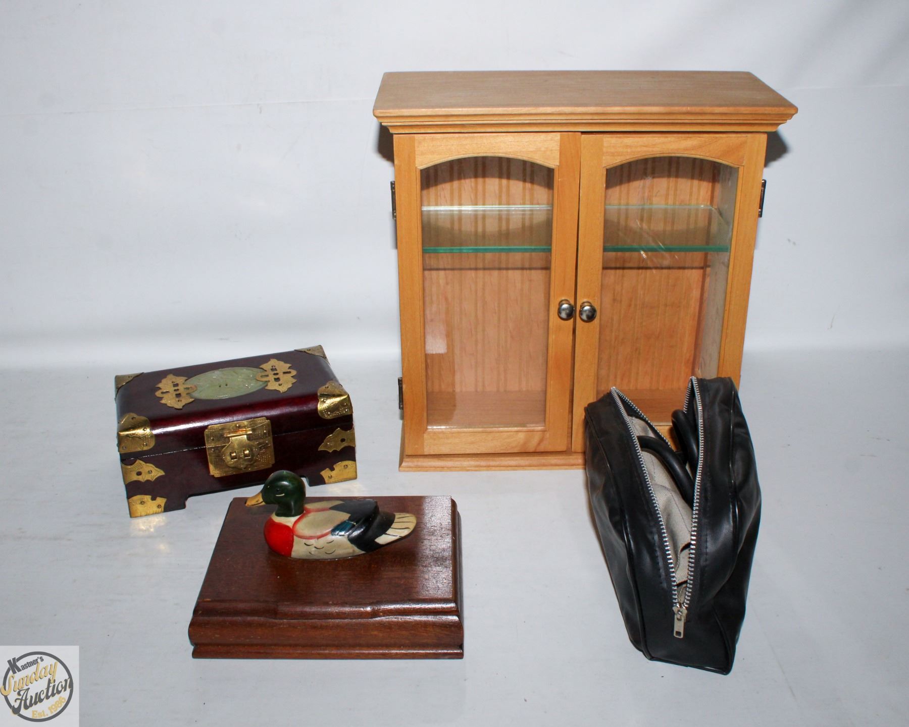 FLAT OF WOODEN TRINKET BOXES & SMALL CURIO CABINET
