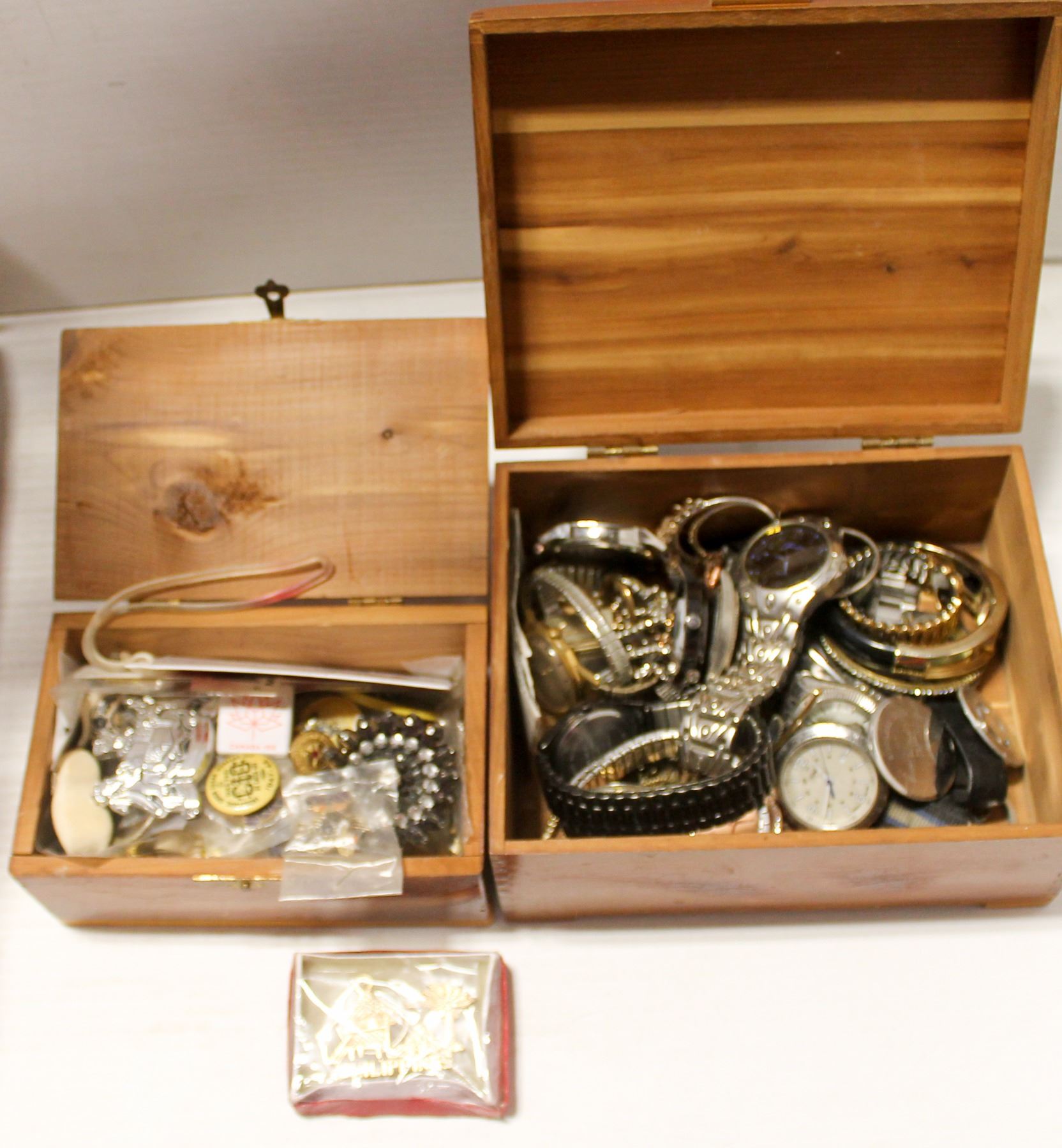 FLAT W/ 2 WOODEN JEWELRY BOXES W/ CONTENTS