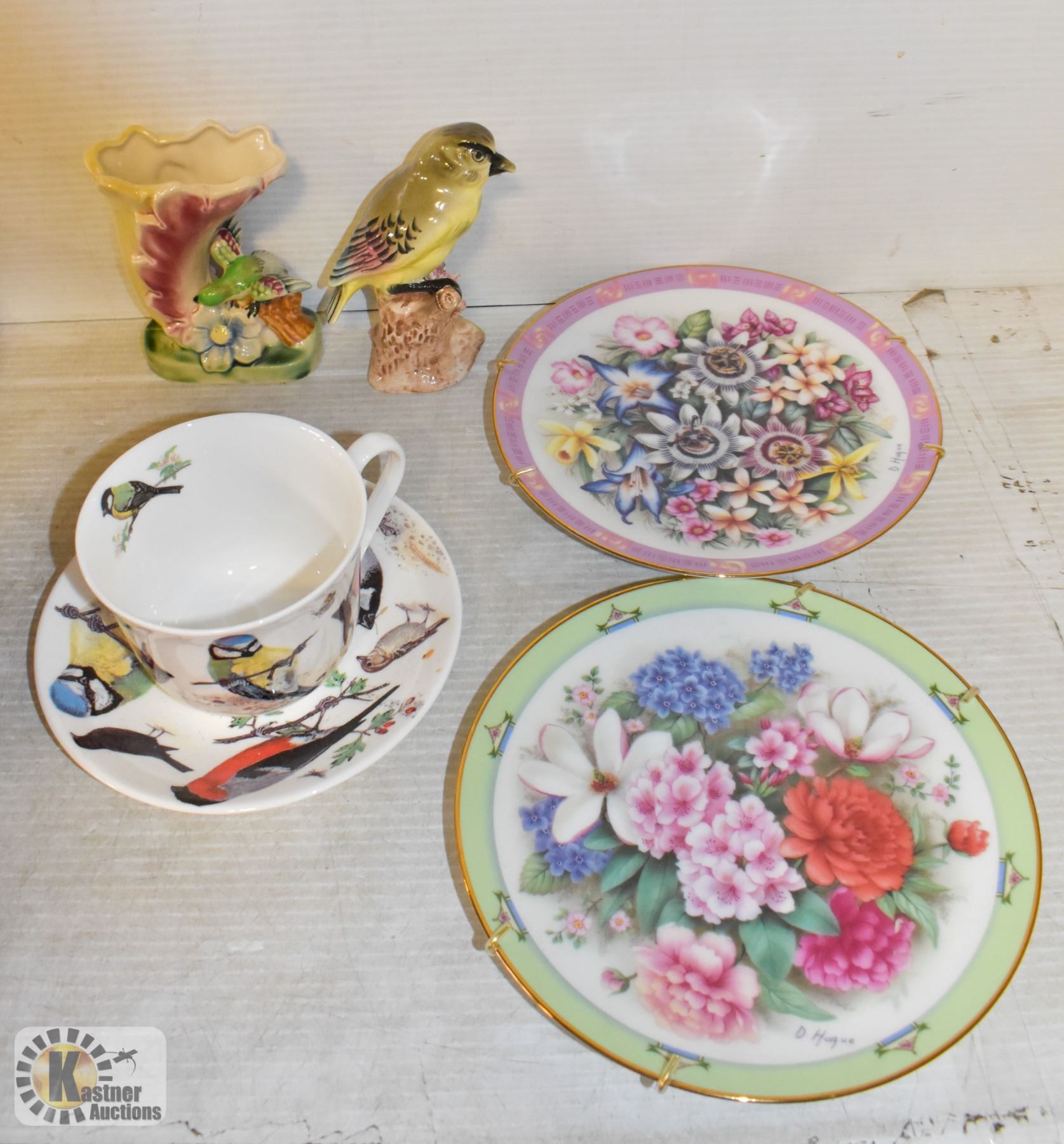 FLAT W/ BIRD THEMED TEACUP + SAUCER DECOR + PLATES