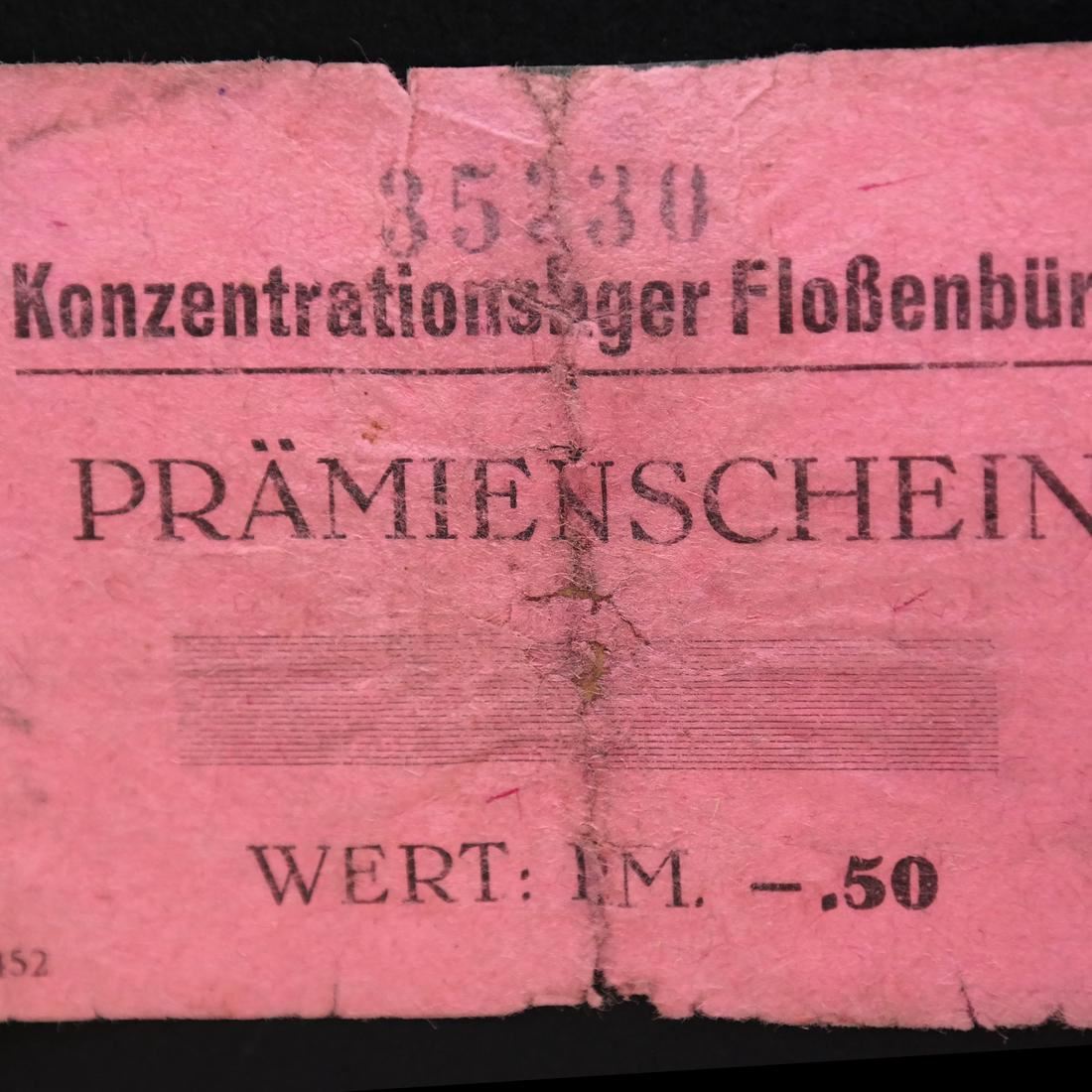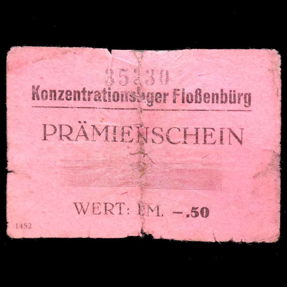 Konzentrationslager Floenbrg / Prmienschein / Wert: RM. -.50 on pink paper, serial #35230, measures approx 74 by 52mm, numerous faults, Good.