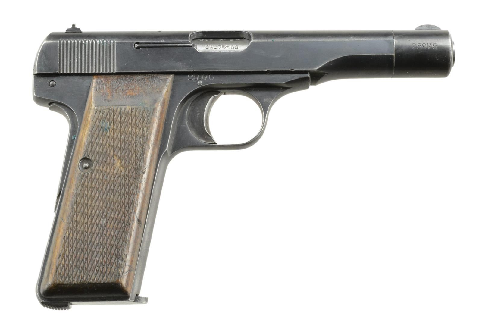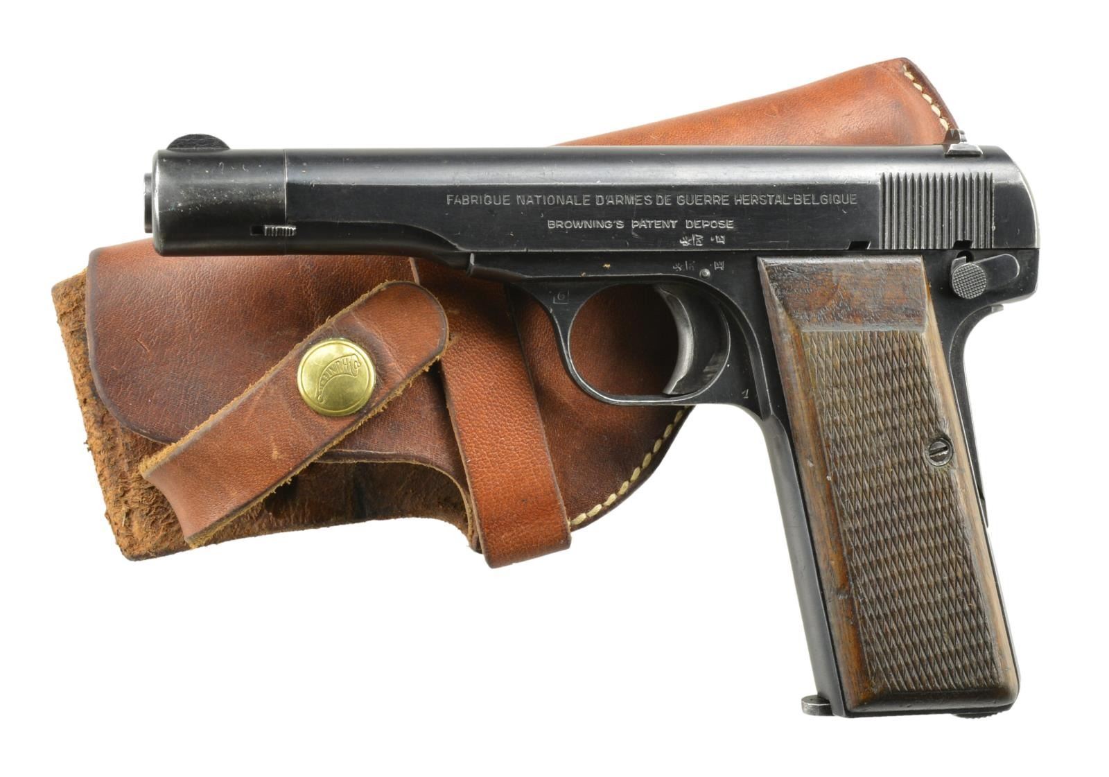 Cal. 7.65mm (32 ACP). S# 25976. Matching numbered 4 1/2" bbl., slide & bbl. lug. Slide, frame & bbl. have Belgian 1926 proofs. Blue finish. Pistol features flanged trigger, grip safety,, butt mag. release & mag. disconnect safety. 2 Piece checkered wood grips. MAGS: 1-9 rd. UNATTACHED ACCESSORIES: Hunter brown leather holster in good used condition. CONDITION: good overall w/ handling marks. Fading blue w/ wear at muzzle w/ pinprick oxidation. Good grips. Very good bore. (22-978/MD). CURIO. $300-450.