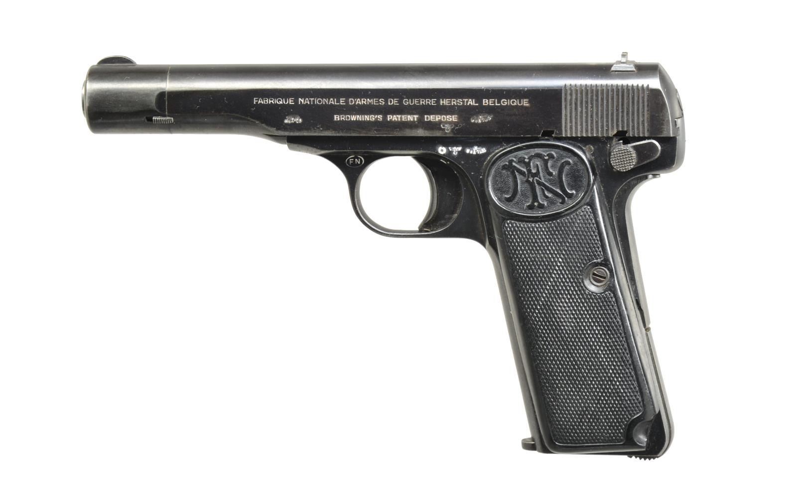 Cal. 7.65mm (32 ACP). S# 29406. Bbl. 4 1/2". Mfg. 1940-1944 during German occupation w/ uncommon WaA103 proofs along w/ eagle party symbol proofs. Checkered FN logo black hard rubber grips w/ relief on left for lanyard loop yet none present. Matching numbered bbl., slide & nose cap. Grip & thumb safeties. MAGS: 3 FN marked 9 rd.: 1 fair matte finished; 2 good standard blued finish. CONDITION: good plus appearance w/ high point holster like wear, function wear & scattered peppery oxidation (mostly in grip area). Light grip hand wear. Very good to excellent bore. (20-3305/NW). CURIO. $500-800.