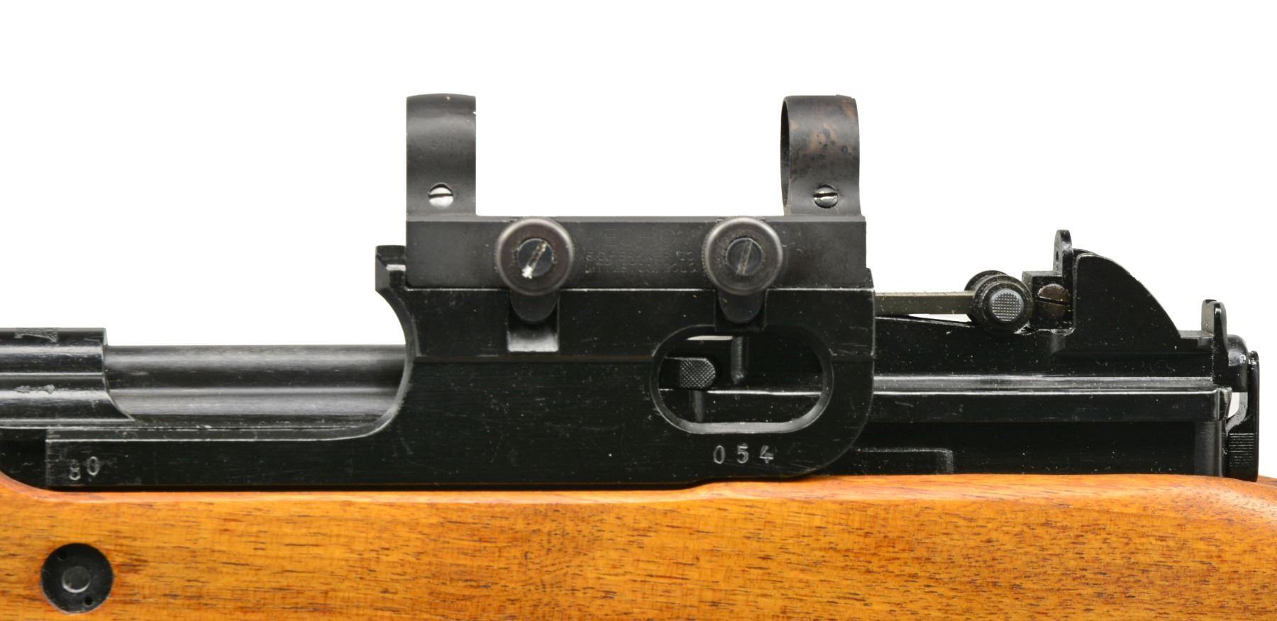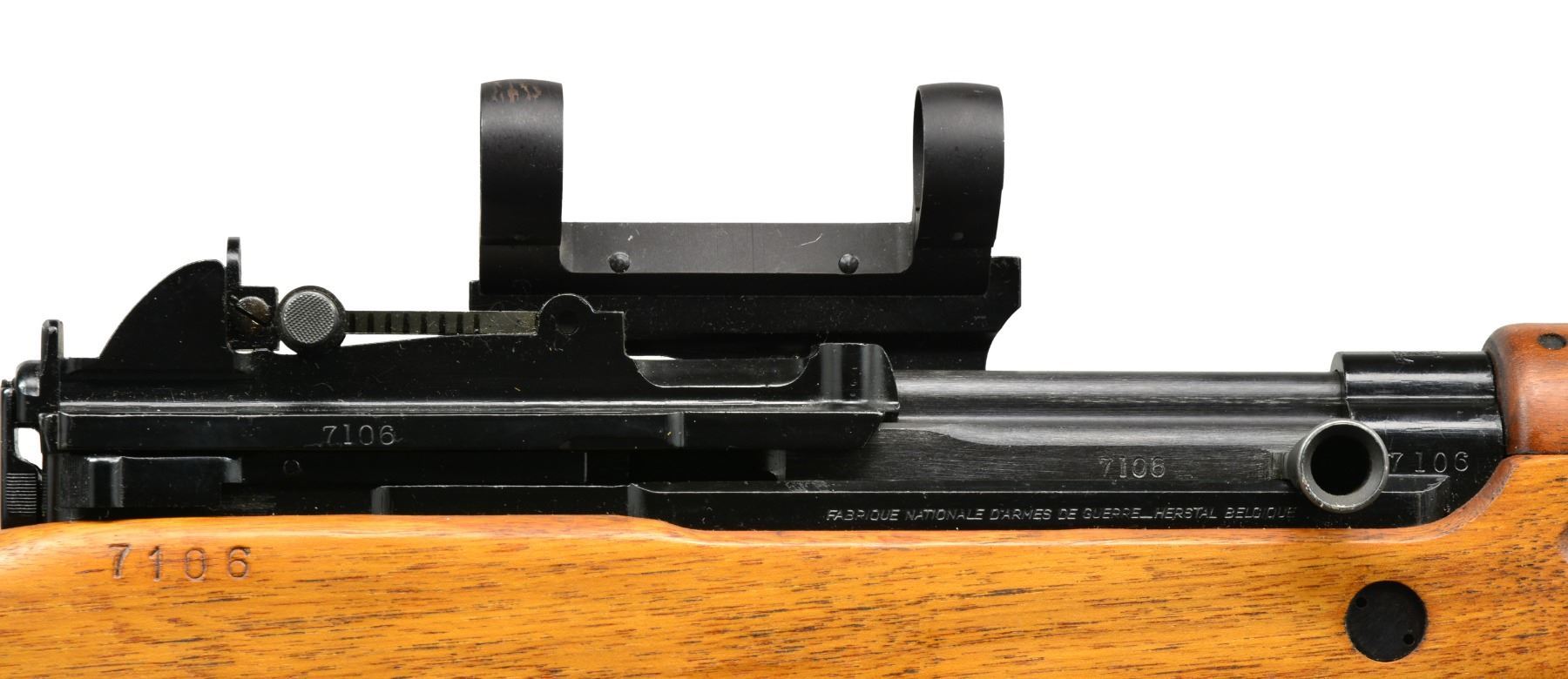 Cal. 30-06. S# 7106. Bbl. 23". Matching S# rifle w/ "AL" on top front of receiver indicating Luxembourg issue. Matching numbered stock w/ sling. Added higher comb for scope use. Receiver has scope mt. numbered "054" at bottom rear with flaming bomb "0" at bottom front. Top of base has an Echo adapter mt. for 7/8" diameter scope. Fixed 10 rd. mag. UNATTACHED ACCESSORIES: plus unmarked type1 bayonet w/ wooden grips. Metal sheath w/ metal hook. CONDITION: all aspects near excellent w/ sling being good to very good. PROVENANCE: Formerly on loan to the Evergreen Aviation & Space Museum. (20-887/NW). CURIO. $2,500-4,000.