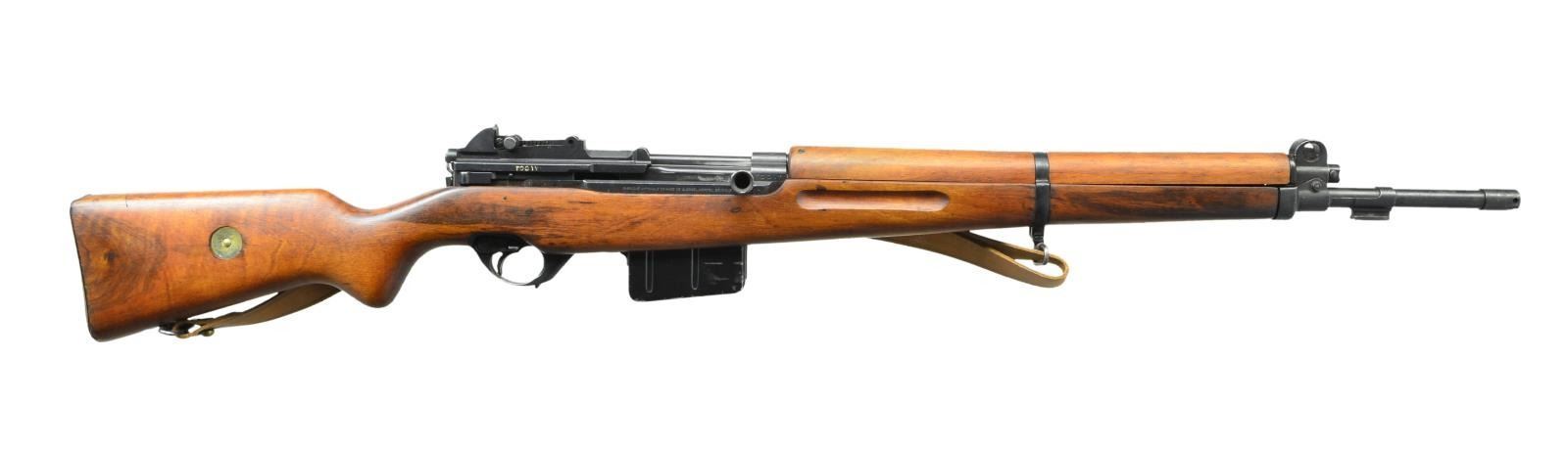 Cal. 8mm Mauser. S# 35517. Bbl. 23 1/4". Receiver ring is marked on top w/ royal Egyptian crown & Egyptian lettering. Marked on left side w/ Belgian proof. Right side has repeat S# in Egyptian. Right receiver rail is marked "FABRIQUE NATIONALE D'ARMES DE GUERRE HERSTAL BELGIQUE". Receiver cover has Arabic S# on right side. Tangent aperture rear sight adj. for windage graduated w/ Arabic numbers. Blade front sight w/ protective ears. Bayonet lug is present. European walnut stock set. Unmarked brass disk on right side of butt. Brass trap buttplate. Military type leather 1" carry strap. 10 rd. non detachable mag. UNATTACHED ACCESSORIES: bayonet & scabbard in good overall condition. CONDITION: stock set has attractive original finish w/ light wear, scattered handling marks, dowel repair at heel. Metal retains 80% original finish w/ light wear & scattered handling marks. Notable flaking on bottom of mag. Good bore w/ lightly worn lands. PROVENANCE: from the estate collections of Charles P. Obremski. (22-1346/RW). CURIO. $500-800.